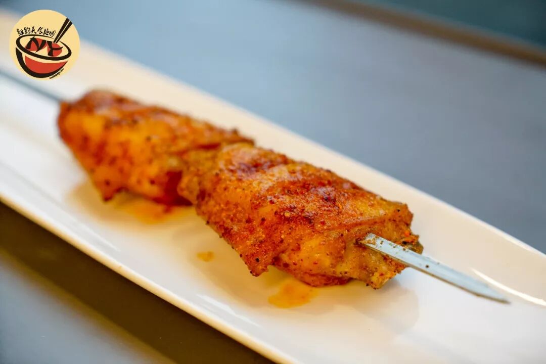 敦煌的烤鸡翅肉多而饱满,完全不似有些瘦鸡翅吃两口就到了骨头。上面划过三刀,想必是为了腌制时更加入味。果然,虽然外皮火候很足,微焦脆的鸡皮刷上秘制酱汁与辣椒面将烤香发挥的淋漓尽致,里面的鸡翅肉却仍保持鲜嫩入味,很不错。