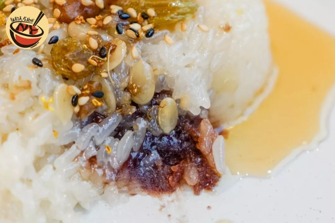 可以看到八宝饭上面撒着五仁、新疆特产的葡萄干和蜜枣,淋上一圈敦煌自制的桂花蜜,再点缀一层白芝麻,口感层次丰富,糯米温暖粘糯,一勺挖下去会惊喜的发现里面嵌着豆沙,甜度刚刚好,吃完香辣的烤鱼来一小碗八宝饭,幸福圆满的结束一顿饭。