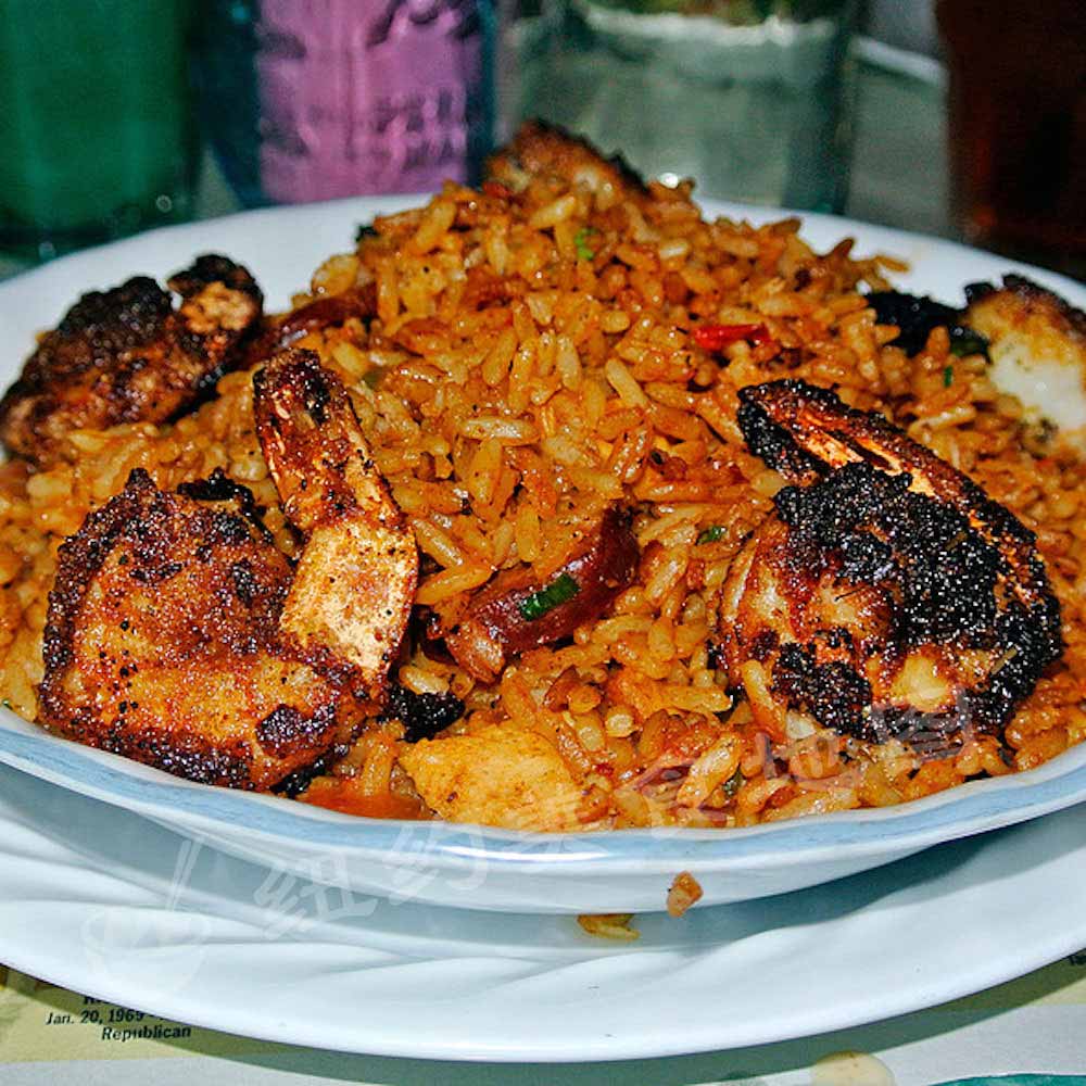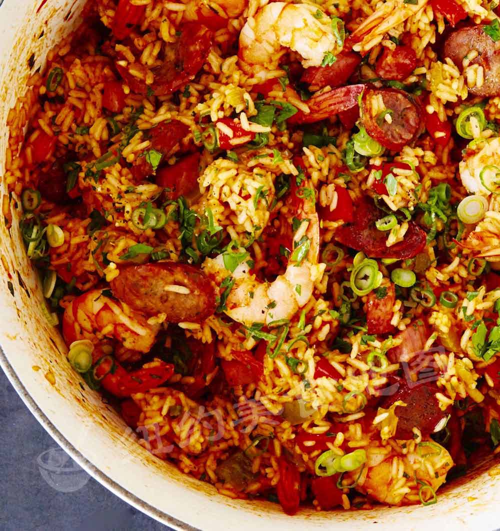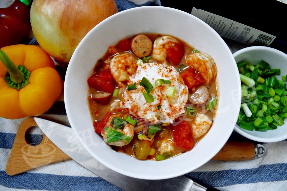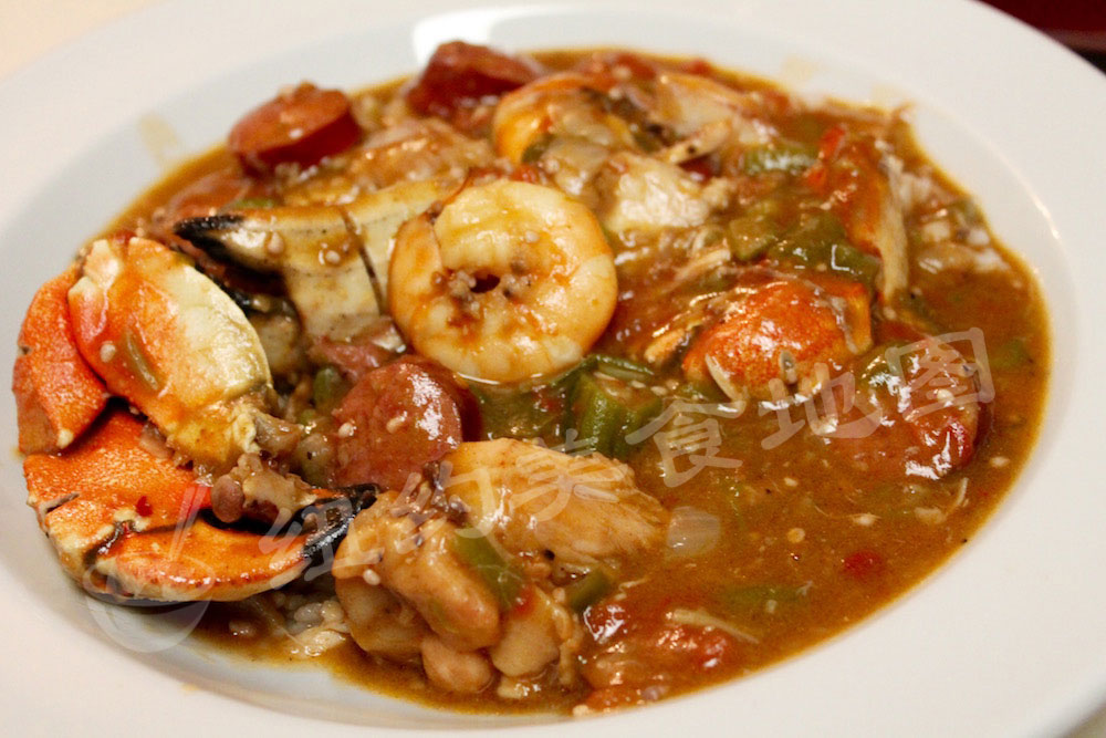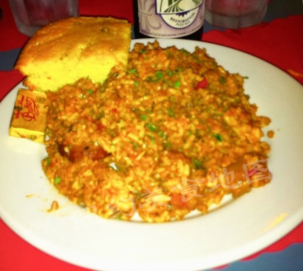 Jambalaya--海鲜什锦炒饭,由 PAELLA 演变而来,但是 SAUCE 和烹调方法还有配料又不尽相同,平常吃的 JAMBALAYA 多为海鲜和香肠共同调制而成。
