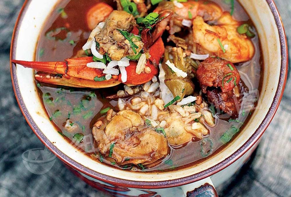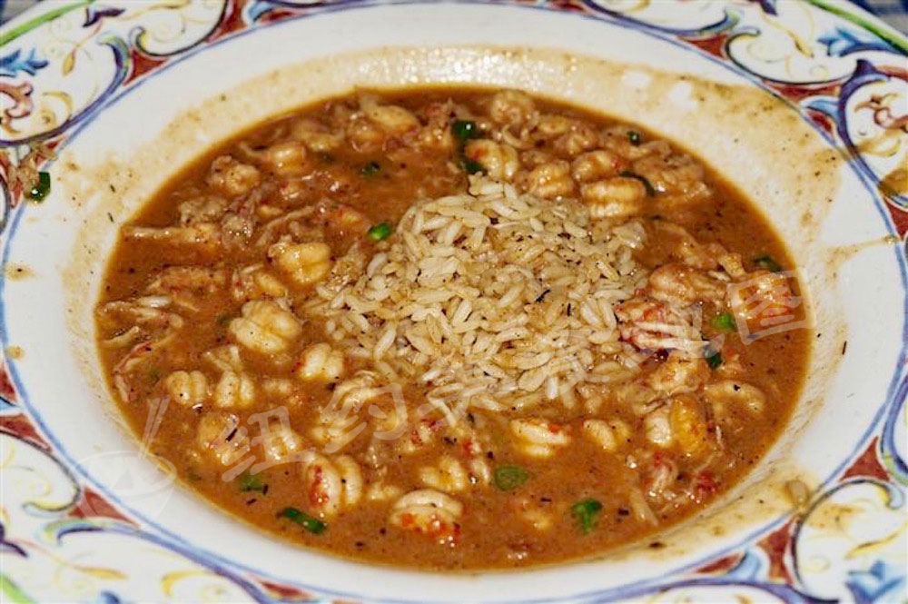Gumbo — 秋葵浓汤,作为美国南部著名的菜肴,这道菜严格意义上来说不算汤类,是一种熬得很浓稠的SAUCE??,浇在米饭上吃。汤底往往会采用肉类和蔬菜配上海鲜煮的浓郁,添加了秋葵更是可以增加汤的浓稠度。根据配料的不同可以分为不同的 GUMBO,常见的有 Seafood Gumbo, Crawfish Gumbo 等等,浇在米饭上吃,十分赞。