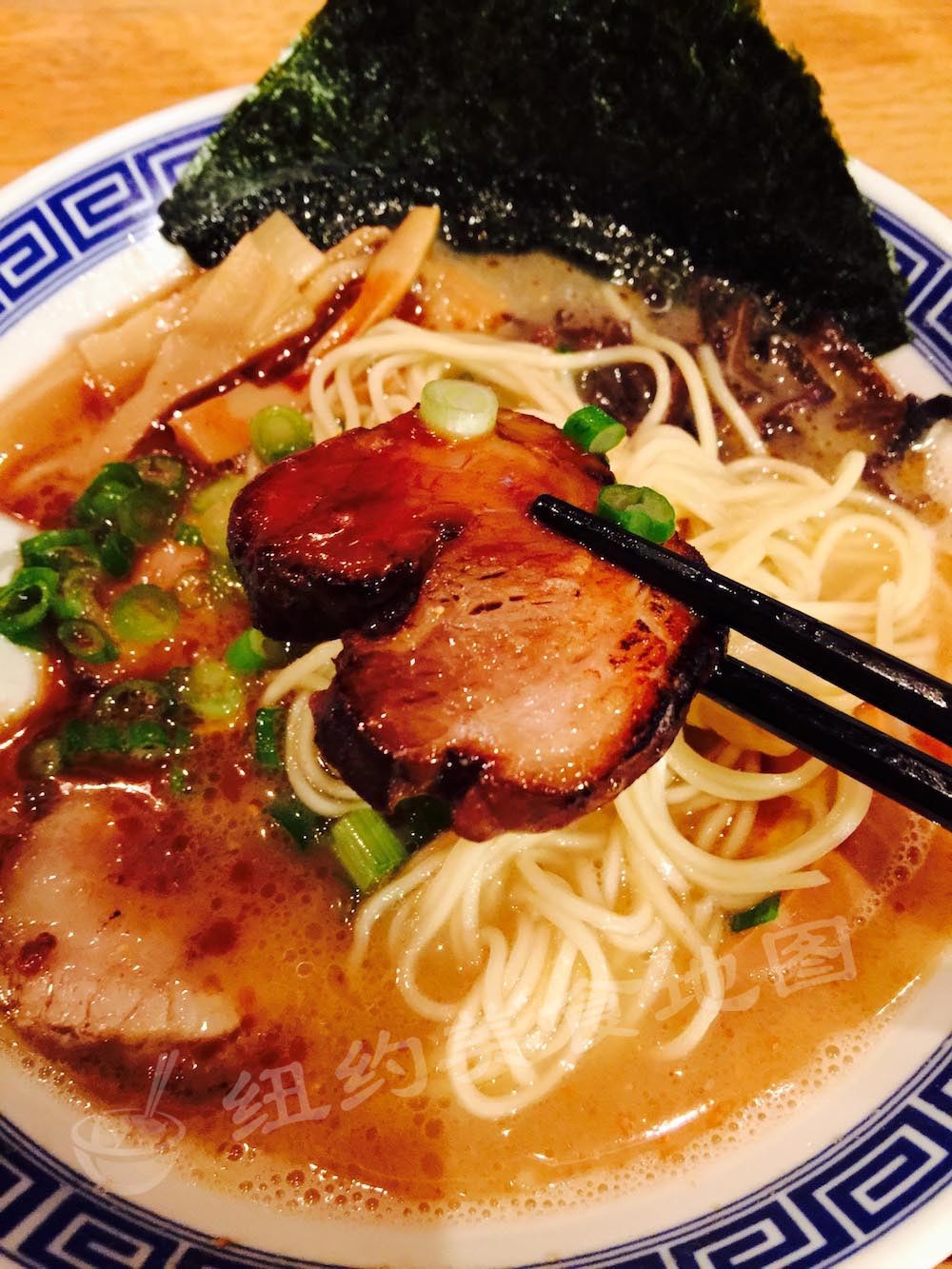 ramen-07位于中城的这家店开业不久就已经积累了不少人气。一是因为店面的设计独具匠心,还原了日本昭和年间(上世纪30年代至80年代末)繁盛的商店街景象,别有一番风味。二则是因为他们店的招牌拉面:黑汤角煮拉面(Kakuni Ramen)。角煮的意思是炖猪五花肉,与我们中国的红烧肉相似,店家大方地给了两大块。黑汤则是加了黑麻油,回味香醇。这样的一碗面,对于爱吃肉的男生的来说,再合适不过啦。