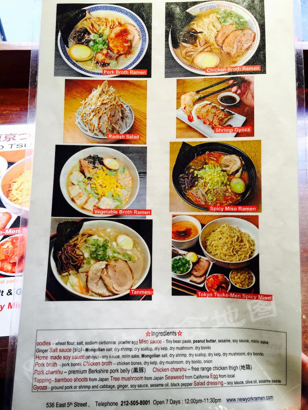 minca-04这家已经有11年历史的老牌面馆在纽约相当有人气,菜单也很丰富,从豚骨面,鸡骨汤面,味增面,到沾面一应俱全。很贴心的是面的种类也是可以选择的,细面,粗面,荞麦面等等都有,任君挑选。他家最受欢迎的当属Minca Sio,用的是猪骨和鸡骨混合的汤底,调味是盐和蒜香口味,深得顾客喜爱。温馨提示,这家店只收现金。