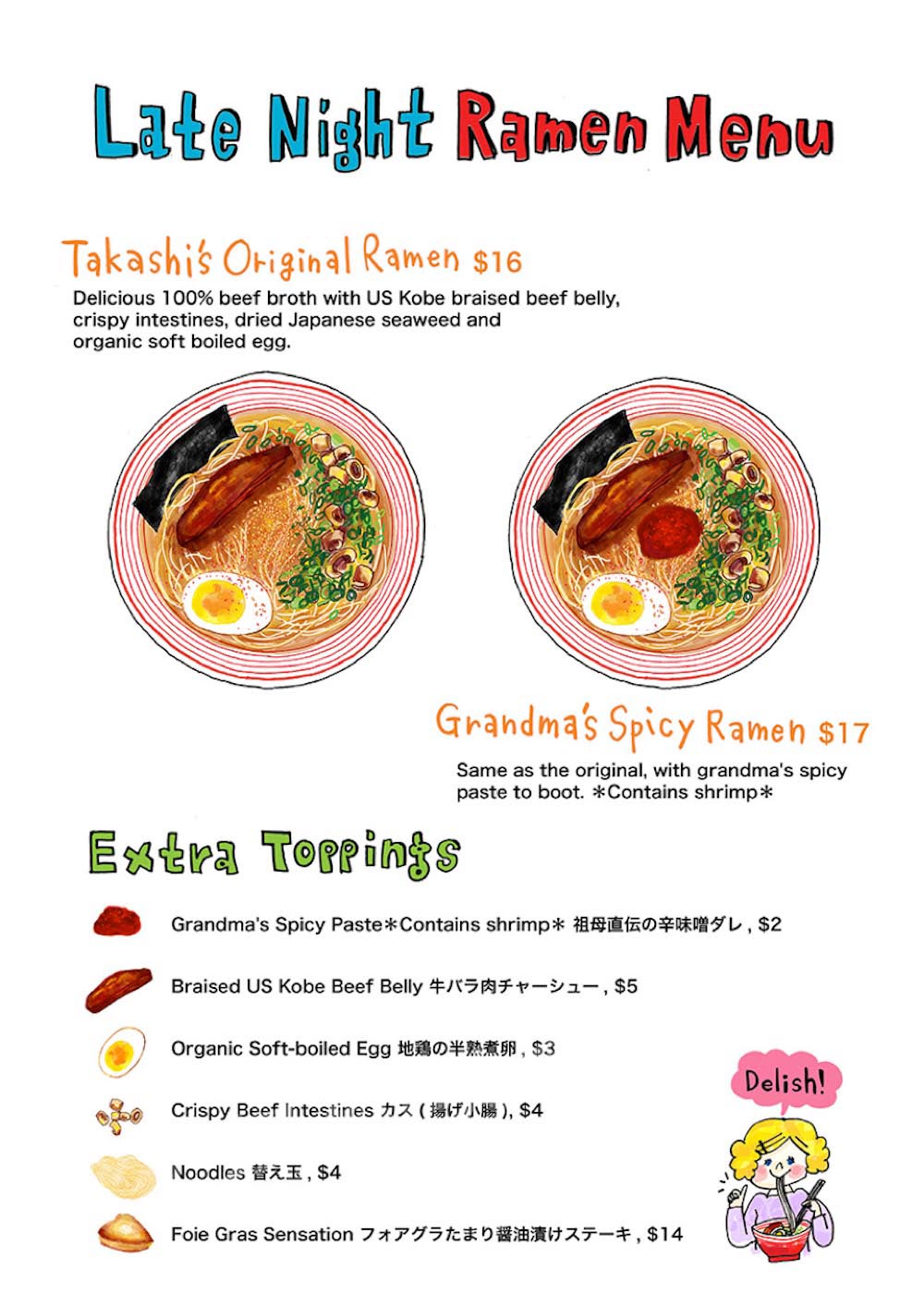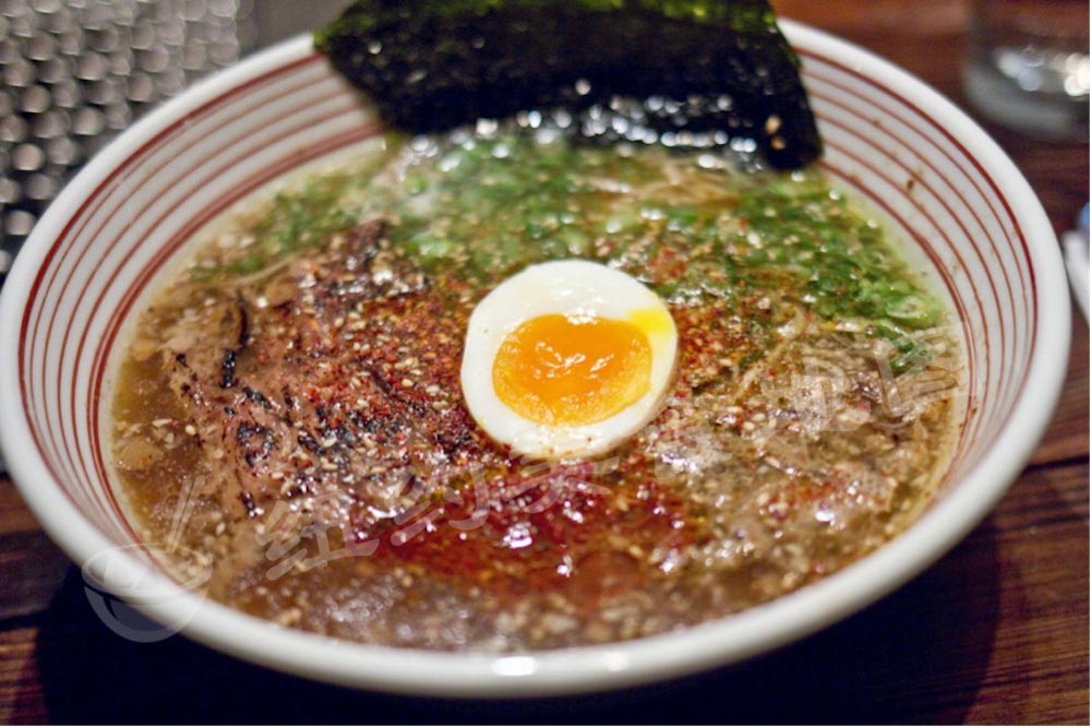 ramen-06不少纽约的饕客们都熟知Takashi日式烤肉和他家招牌菜:神户牛配海胆。但很多人不知道,他家还有一个秘密菜单——深夜拉面。每周五和周六的晚上,一过午夜,Takashi就开始提供自制的牛肉汤拉面,可谓是名符其实的‘深夜食堂’。要吃上这一碗深夜拉面可不容易,一般至少要提前两周预约,如果想碰碰运气也可以walk-in,不过要做好排队1小时以上的思想准备。菜单上只有两个选择:Takashi私房拉面(Takashi’s Original)和它的加辣版本:外婆的香辣面(Grandma’s Spicy Ramen)。而这一碗面确实有些与众不同:汤底是用神户牛骨熬制24小时以上而成,配上神户牛五花肉片,大阪特色的酥炸牛小肠以及温泉蛋,也难怪人气这么旺。小编推荐点加辣版,他家的辣酱特别好吃,据说是店主Takashi的外婆的独门配方,加了虾酱,味道鲜美。