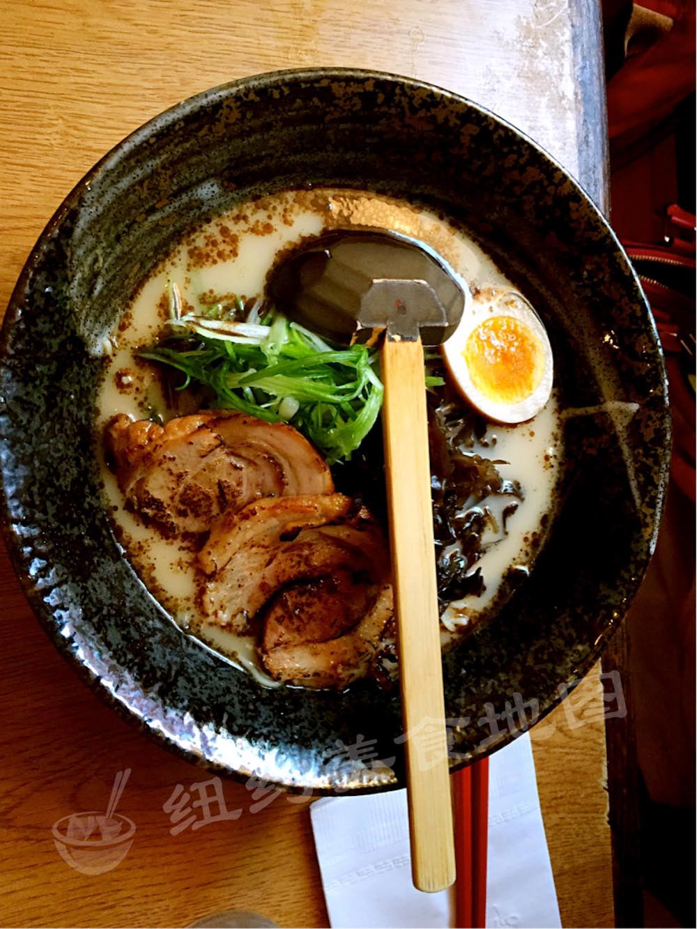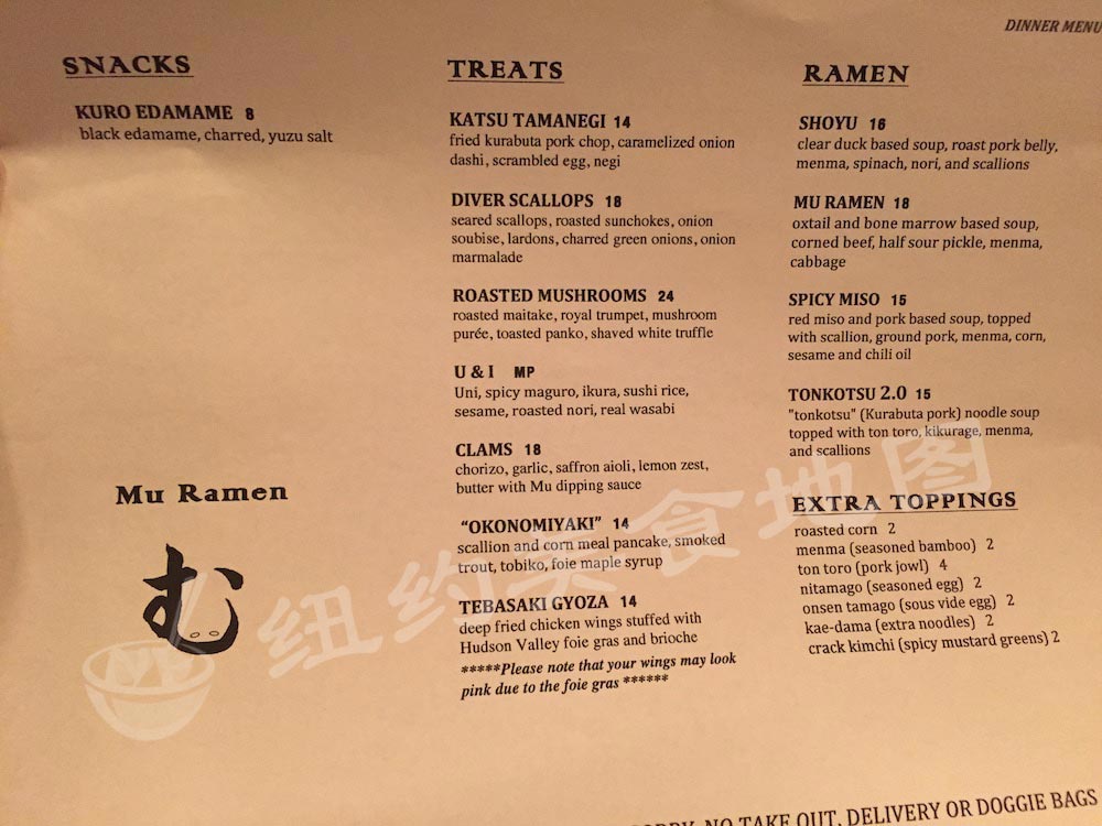 ramen-24位于Long Island City的拉面新贵,CHEF Joshua是在Per Se历练多年的有才大叔,单飞后和妻子开了这家非常有料的新派拉面,店面不大但设计新潮时尚,开业不久已经有了相当数量的追随者。推荐必点招牌豚骨拉面Tonkotsu 2.0($18)和牛尾拉面Mu Ramen($18),拉面的选择不多,但精心熬制的汤头搭配不同种类的拉面还是很值得尝试的。还有去骨鸡翅填上鹅肝酥炸的开胃小食。也是少见提供OMAKASE的拉面店,不过价格有点小贵,分量也不多。地图君曾经目睹对面一位十分精瘦的日本MM吃完一碗面后又加了一份光面火速吃完。。。