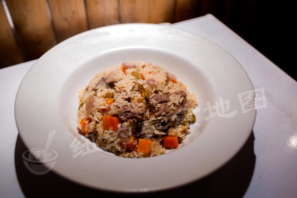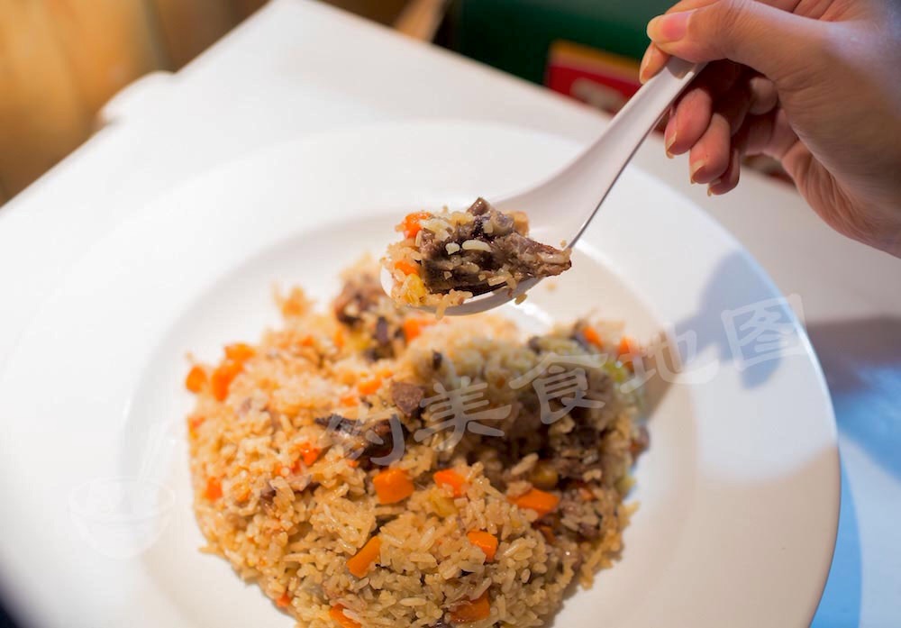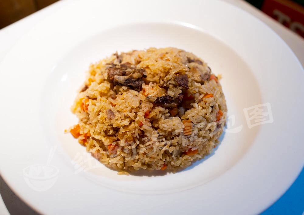 看似新疆家家户户都能做的手抓饭,要做到好吃,实则不易。光是为这道饭地图君和小伙伴就去试了三次,不得不佩服老板真的是拿出做科研的精神在做菜。。。从香米到日本米到印度的Basmati米,最后终于找到了最适合做抓饭的米–东北五常米。由于抓饭的制作工艺比较复杂,米需要经过浸泡再从焖制到熟成等各项步骤,太长容易碎,太短没口感,而五常米中粒饱满嚼头最好,浸泡再与汤汁焖煮后还能保留很好的嚼劲儿,特殊的米香也让抓饭添了不少色。整道抓饭采用两个部位的羊排做成,有羊骨和羊肉粒为主料,正道饭端上来羊肉香气扑鼻,每科米粒都包裹着羊油色泽光亮,饭粒很有嚼头,羊肉软烂而不柴,胡萝卜和葡萄干给整到饭增加了甜味,丰富了层次,非常赞的一道抓饭!
