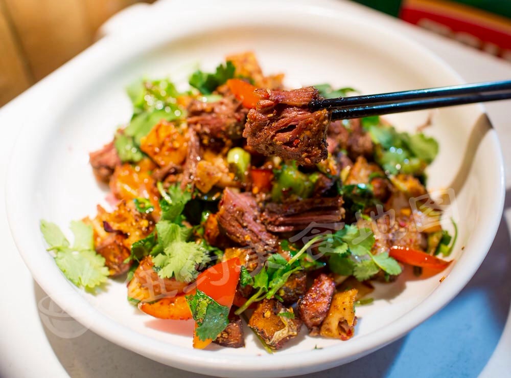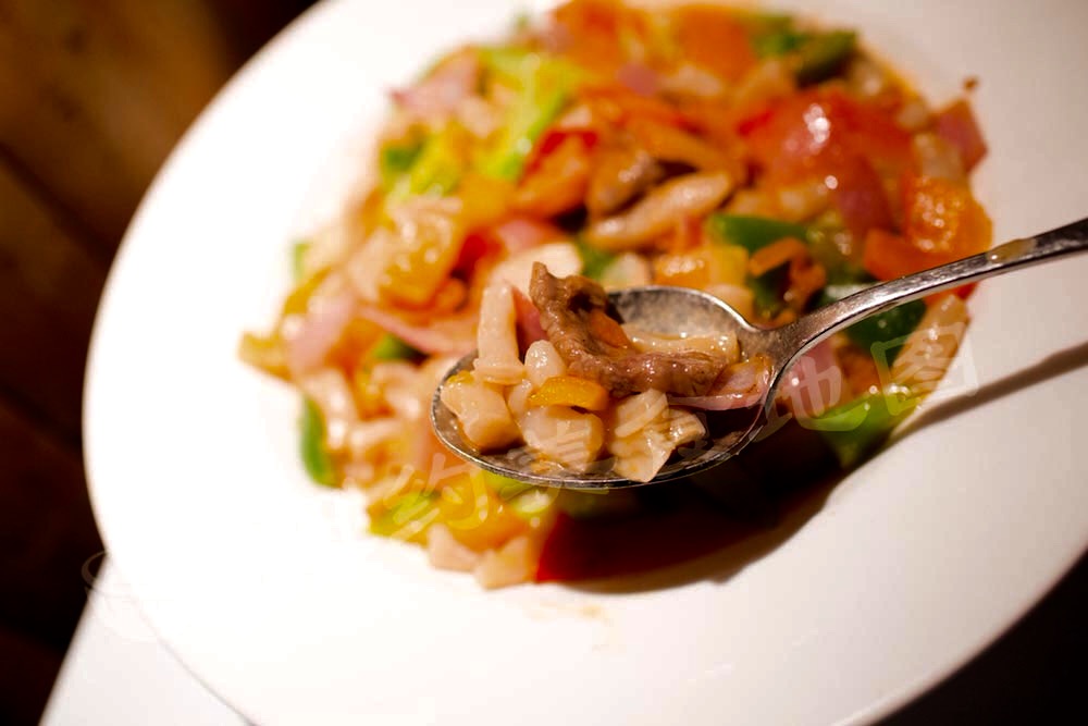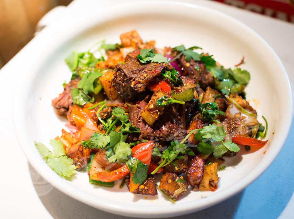 酸口的开胃小炒面食,面都是现拉的再切,SAUCE微酸吃着很开胃,西红柿搭配芹菜洋葱混合牛肉片快炒出锅,很家常却很好吃的一道小食。