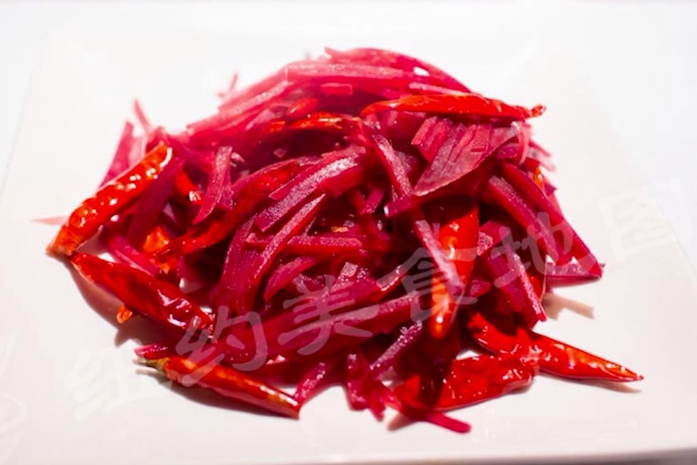 最让人惊喜的就是这道菜!甜菜还可以这么吃?大师傅不愧是川菜大厨出身,炝锅的功力一流!干辣椒呛得色泽鲜红干辣的香气十分诱人,甜菜丝切成细丝儿和少许清油略炒,只加了少许盐调味,就成了如此一道清丽脱俗营养好吃的美味!一丝甜菜的土腥味儿也没有!口感有些像榨菜版的脆口,先是呛辣的爽气,然后是甜菜的清脆陪着盐巴的咸味儿,后卫透着甜菜的清甜,看似简单实则功力深厚,超级推荐一定要点!很健康的一道新疆小吃!