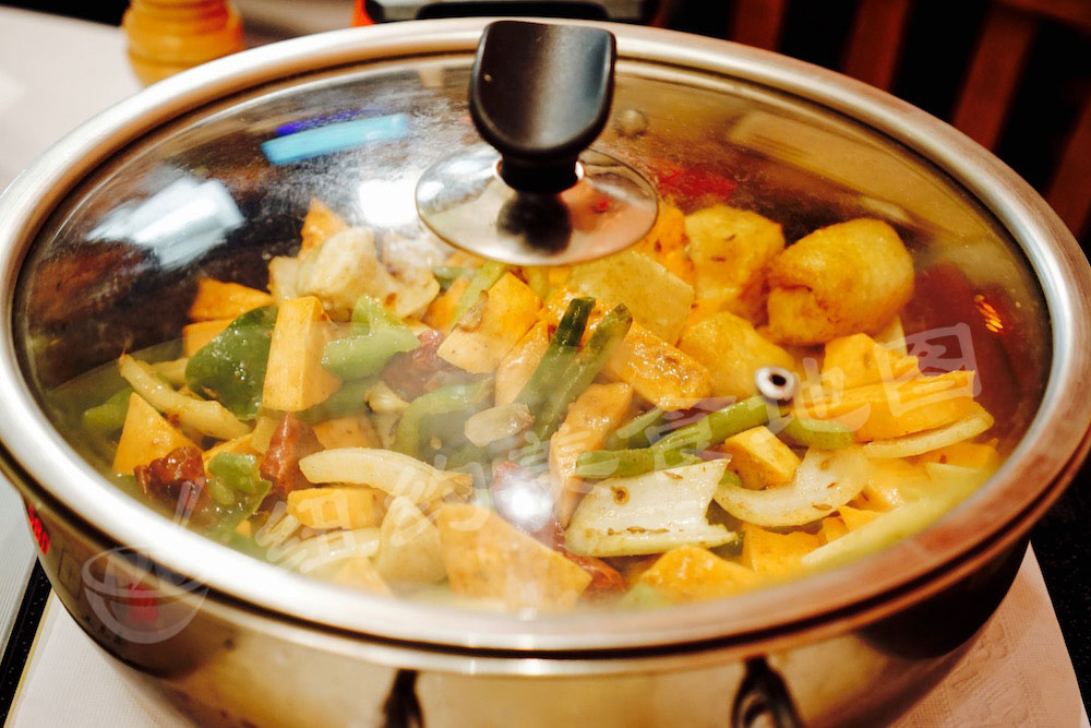 gu-xiang-wei-a-34湘味儿的干锅跟川味的麻辣香锅看着类似,但味道上却很不一样。川味的麻辣香锅味觉上更重一个麻字,卖相上的红油也略为浓重一些,因此入口则是从麻到辣,红油带来的刺激和辣感较为强烈和直接,但是不持续;而湘味儿的干锅看着干干的,没有花椒的点缀,但吃起来小米椒的干辣后劲儿可不是盖的。这款干锅一端上来,呛辣的强劲儿就扑鼻而来。