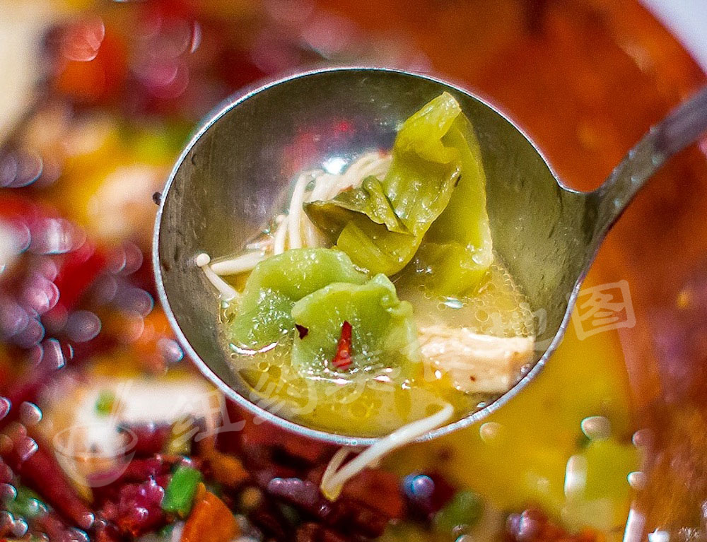 gu-xiang-wei-a-25土鸡切小块与剁椒和萝卜慢慢在铁锅里滚着,先吃了鸡肉,滚了这么久鸡肉还保持嫩度,很奇妙;加了剁椒的鸡汤入口是鲜酸的,辣辣的后劲儿随之而来;这道菜一改大家对土鸡锅的看法,不是清淡的滋补,而是酸爽开胃的鲜香,白萝卜切小丁刚入锅是脆脆的,很快就绵软熟烂,一口爽辣的鸡肉配一口软绵清甜的白萝卜,再来一口酸辣的鸡汤,两个字:完美!