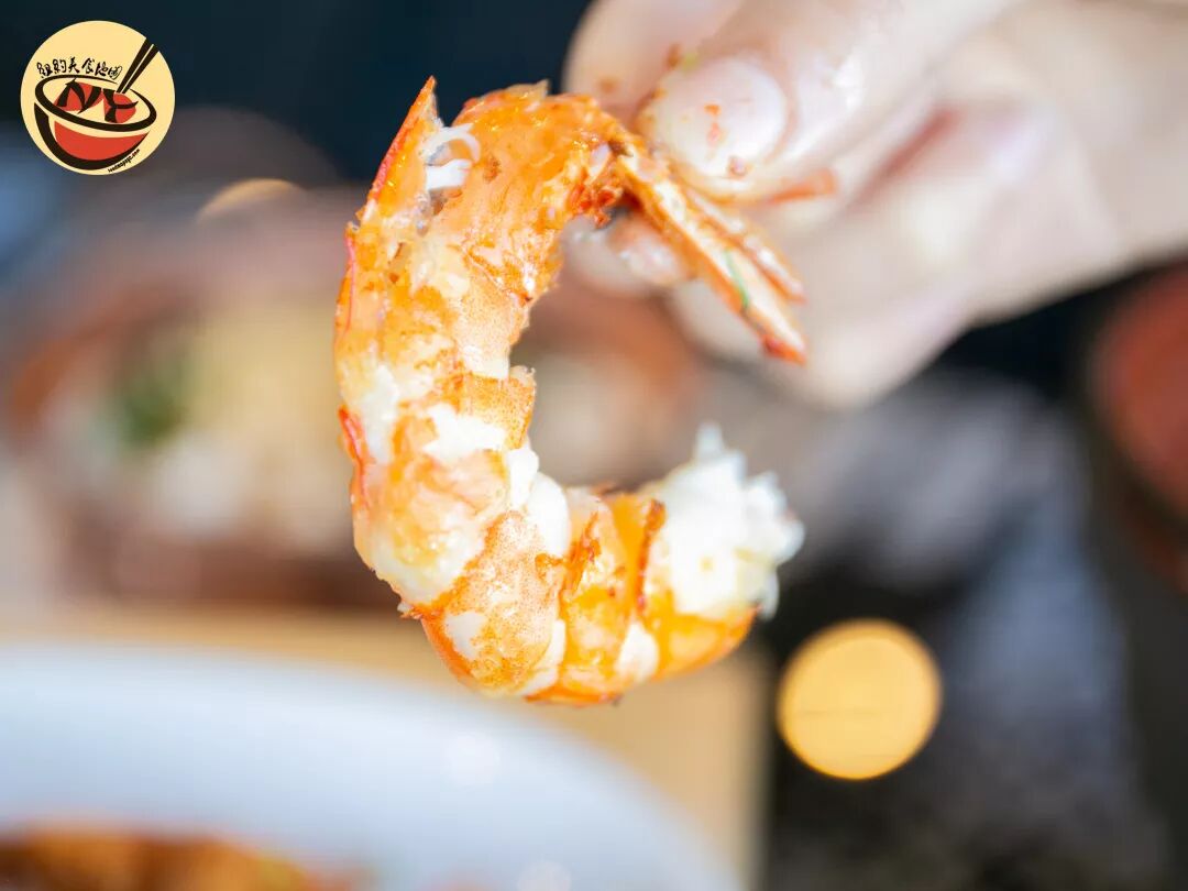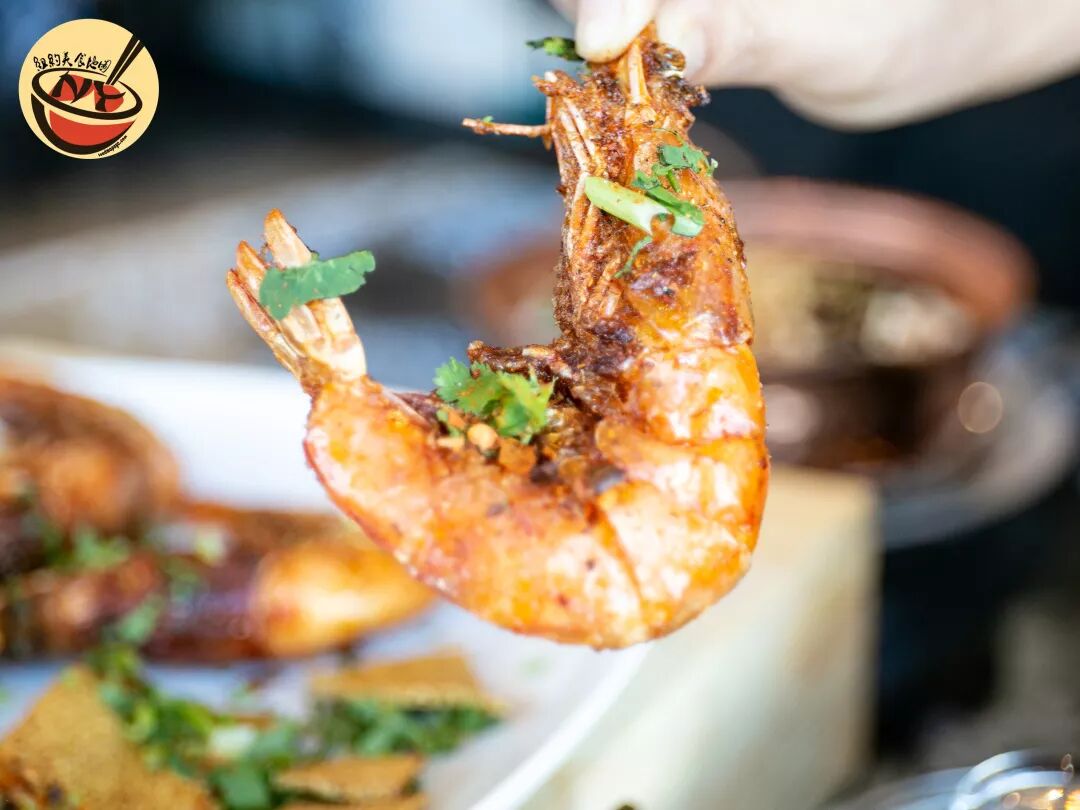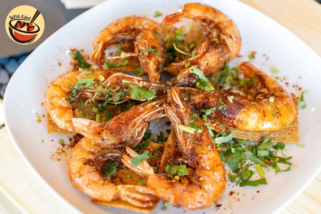 大虾个头赶得上女孩子的手掌心,用菜籽油炒制的辣油,香菜将大虾烤制的外皮酥脆。拨开虾壳,虾线也去除的十分干净。