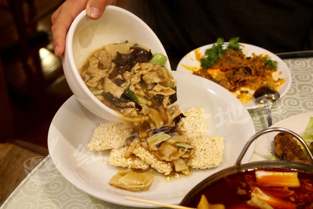 当滚烫的芡汁儿菜码淋到刚出锅的锅巴上那一瞬,轻轻爆开的滋滋声就告诉小编这道菜错不了,师傅没有让我们失望。肉片鲜嫩爽滑,汤汁咸淡得当,勾芡的刚刚好,轻轻的包裹在锅巴上,入口先是淡淡的料酒香气混合肉香,软绵的芡汁儿带着锅巴的微脆,平凡中见真章!