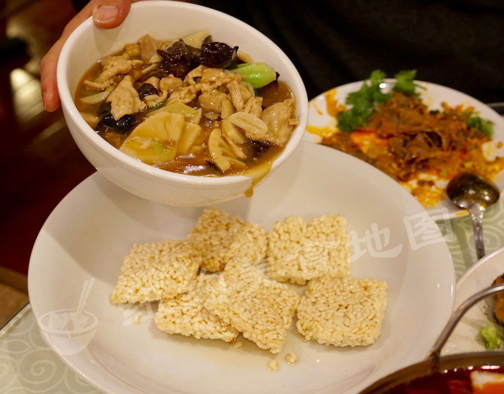 锅巴系列,看似平常,好吃得看真功夫—锅巴是否炸的酥脆,菜码是否汁儿浓味儿正,都决定着这道“家常”菜是否成功。地图君试过N多别地儿的锅巴系列,不是锅巴炸的蹦牙效果杠杠滴,就是芡汁儿勾的比例不对。过浓整道菜就是一团糊糊,干干黏黏让人没有食欲;过稀那锅巴即使炸的再酥再脆,很容易就泡软。各方位全部配合到了完美,才能成就这样一道菜。