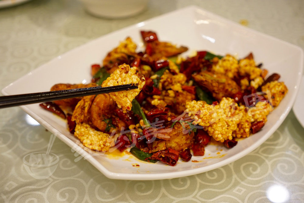 香辣虾在川渝两湖地区都是一个较常见的菜。不同地区的做法略有不同,但总体上都追求红亮的色泽,香辣的味道,还有虾肉的鲜美弹牙。尚禾坊的版本很好的诠释了这几项精髓。选用大个头的黑虎虾,炸到刚好壳肉分离,外脆里Q,再加上早就飘来的干辣椒的香味和油亮的虾壳反射出光泽,整个都在撩拨小编的味蕾!服务员特别嘱咐一定要连壳带肉一起吃,保证有惊喜。当牙齿碰到虾壳的一瞬间,那“嘎嘣脆”的感觉立马充满了整个脑袋,爽的不要不要的。至于味道嘛,记得小时候吃的虾条吗?就是那种感觉!只是虾条更酥,而这虾壳更脆,再搭配上扎实的虾肉,实在让人惊喜。小编在国内吃到的香辣虾多半选用时蔬作为辅菜,而尚禾坊的大厨发挥创意,用锅巴来搭配,让整道菜爽脆到了极致。