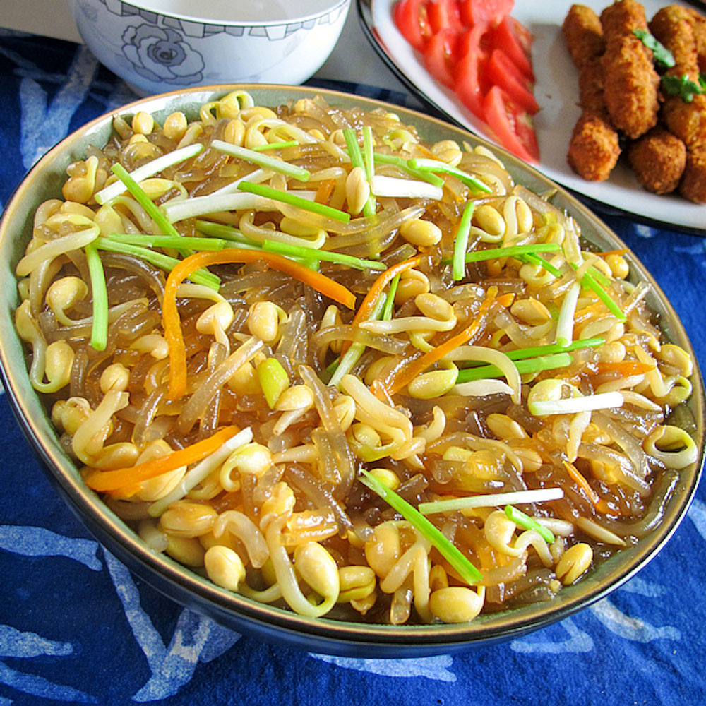另一道菜就是豆芽菜炖豆腐粉条了。母亲的年夜饭,每道菜要取个吉利名堂的,过节习俗是根深蒂固了,而且每年必须是有一道素菜的。这道菜是财富长久。因为母 亲一直是自己发豆芽菜,所以做出来的味道最是鲜美,而豆腐又是"千炖"(老话千炖豆腐万滚鱼),加上口感弹牙的粉条,再酱色轻染,色香味全,是年夜饭桌上 的唯一素菜。