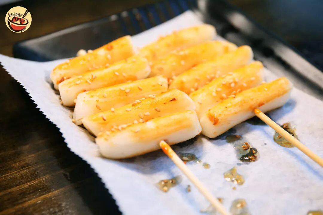 这家烧烤店对味道很有自己的一套见解,烤年糕的口味偏韩式,外面裹了一层薄薄的糖浆,烤完以后外层有一层甜甜的硬壳,“咔嚓”咬开它,软糯的年糕就在口中!