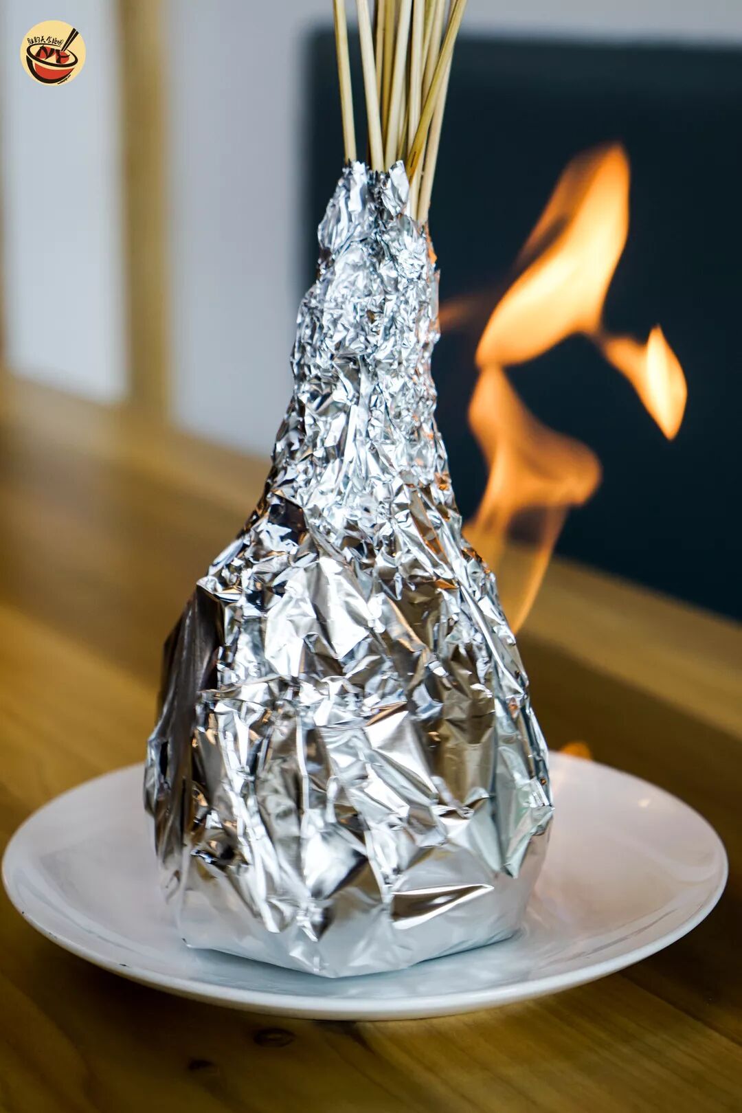 一边喷火一边用锡纸紧紧包裹的火焰虾绝对是回头率最高的小吃之一!来看一下上菜现场: