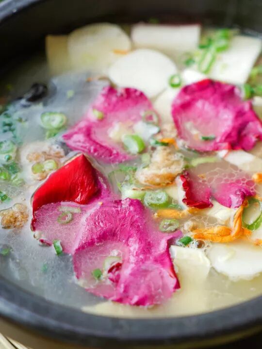 早就听说云南菜擅长把鲜花融于料理之中,今天终于见证了~大朵的可食用玫瑰浸泡在高汤里非常的艳丽吸睛,满满自然清新的气息瞬间袭来;在高汤中还有虫草和干贝一同入味,山珍海味全齐了,鲜入灵魂!