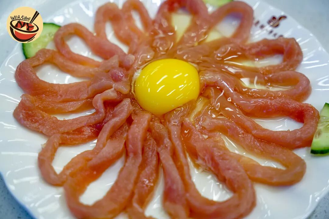 十分养眼的一道菜,里脊浅粉,有黄瓜翠绿点缀,再打上一颗嫩黄的蛋,怪不得这菜品名称也是美的不像话了。作为涮品,是猪肉里面的佼佼者了,不要丢进锅里就忘记,否则会很硬。
