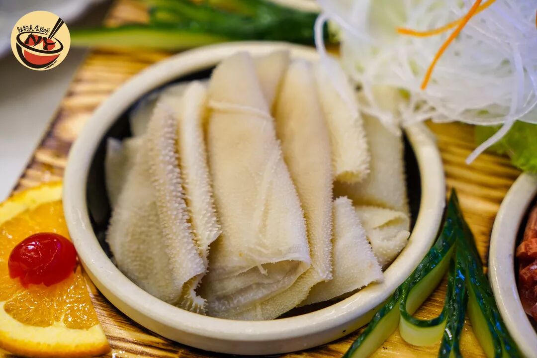 黄喉同样作为牛油锅标配,吃法参照毛肚。外表极具迷惑性的黄喉,看上去和雪白的山药无异。师傅细致,将其片花,待煮熟捞上来的时候,有种平日里所见腰子的形状。口感爽脆,比毛肚有过之而无不及!
