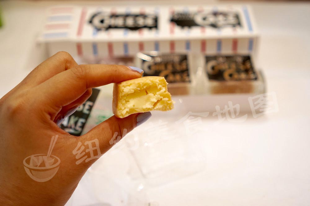 丹麦的cream cheese,日本的酸奶油和北海道小麦混合而成的浓郁酸甜。包装很和果子风,印花油纸的包装。一打开包装,就闻到浓郁的芝士味,微酸,和浓浓的奶香,非常诱人。轻轻咬了一小口,内馅儿的芝士仿佛能够轻轻流动似的滑腻,润口;外部薄薄的一层芝士蛋糕,香浓滑腻;内馅儿的芝士软绵可口,甜中透着芝士特有的微酸。