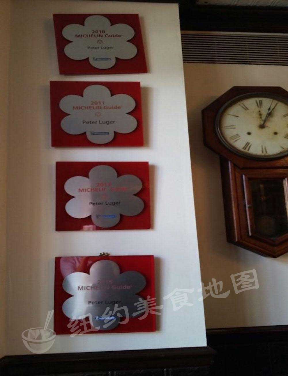 进门就可见的多年米其林一星奖牌以及各种其他奖牌,以及PETER的画像
