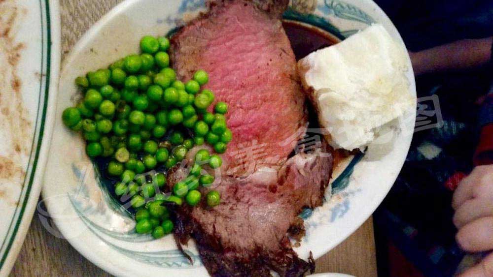 既然是中午,大家还是决定试一试今天的午餐特供,Prime Rib是指牛肋骨6到8块之间带筋的肉,这块的肉相对紧致实在,油脂非常丰富。套餐配菜加入了水煮青豆和烤大土豆,配菜略显一般,所以大家都没怎么动手。到是prime rib本身非常惊艳,虽然也是要的七分熟,却也是鲜嫩可口,入口感觉舒服实在,不油不腻,外型上虽远不如Porterhouse来的诱人,但朴实中也展现牛排选购的不俗实力。