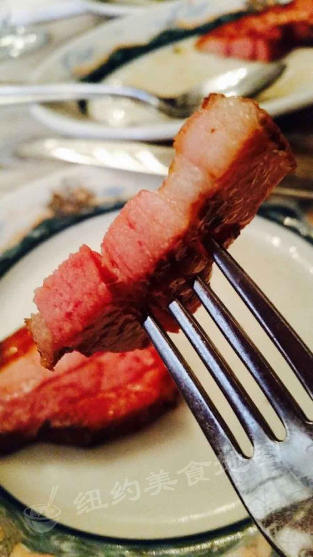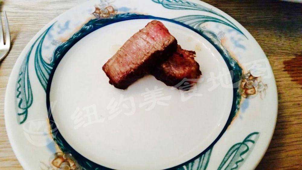 牛排上桌还在冒着嗞嗞油花,细心且高冷的服务生会提醒你小心,因为此时装盘非常烫手,同时熟练的为每位客人分上两块切好的牛排,每块淋上一点盘中的牛油,一块来自filet,一块来自New York Strip 。filet取自牛腰最嫩之处,由于活动量小,脂肪含量少,纤维不粗,属于的最贵牛排之一,虽然为了照顾长辈点了Medium Well (七分熟) ,还是能品尝到牛肉的鲜美多汁,入口那种肉质本身的细腻温柔。 New York Strip 属于前腰里脊,这部分的肉脂肪分布丰富且均匀,生肉大理石纹清晰可见,虽然没有Filet那种柔嫩的口感,肉身嚼劲十足,配上脂肪带来别的牛油香度,大家吃的不亦乐乎。牛排外侧大火煎制过程中稍稍焦化,使得外部有一层焦脆微苦的口感,不喜欢的朋友可以切掉,但小蚊觉得这正好综合了牛排本身脂肥肉嫩的特点,满口散发着牛油香气的蛋白质配上这焦脆的感觉,更能刺激食客的味蕾。