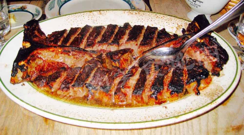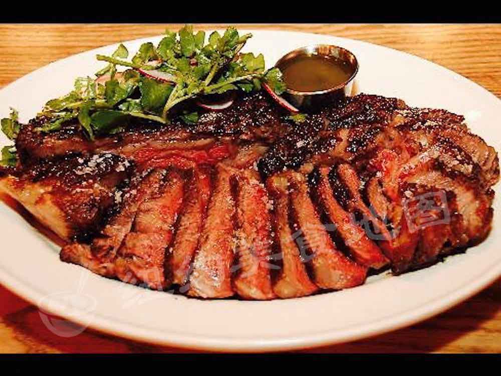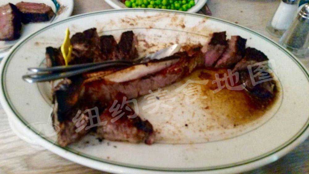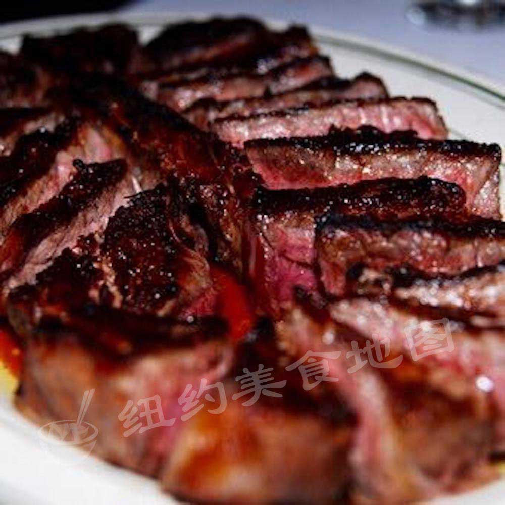 来Peter Luger 一定一定要试的百年招牌精典牛排!牛排本身是Porterhouse ,也就是所谓大版本的T骨牛排,肉质以中间的T骨一分为二,一半是filet (菲力牛排)一半是New York Strip(纽约客牛排) 。 在这里小蚊又要啰嗦几句,其实牛排并不需要什么高超复杂的烹饪手法,为何他家可以百年不倒,这其中秘密之一来自食材本身的选择。 Peter Luger历届掌门人都是牛肉专家,餐厅所有牛肉都是经过掌门人亲自筛选,菜单上简单的写着USDA Prime标识,在这后面都是历代掌门人多年苦心钻研,自成一派的牛肉筛选技术,称之为The art of Beef selection 也不为过。另外一个秘诀就是他家独门Dry aged 牛排的方法,在超过两千尺严格控温控湿的大冰柜里随时随刻都有超过30000磅的牛肉秘密风干,牛肉表面在超过20天的风干过程中丧失水分,这时候表面会形成一层“硬壳”,而肉汁浓缩在了内层的牛肉里,经过一系列化学反应,牛肉自身的酶自然让肌肉纤维分解,然后去掉表面硬壳部分,内部更加鲜嫩多汁的肉质才最终成为食客们的盘中餐。