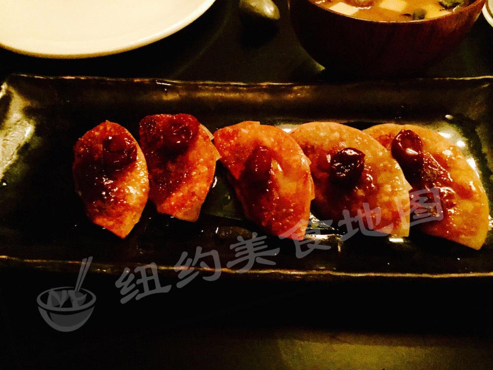 这家在Chelsea的Cherry,是一间融合了法式浪漫与日式风情的中档餐馆,YELP上的评价似乎很高,但人气不怎么旺。因此好像常常GROUPON有DEAL。小蓝对这间餐厅的鹅肝饺子垂涎了很久,但是因为三个$$$的评级一直犹豫。碰巧买了这次的GROUPON,拉上M在一个极冷的阴雨天小试。最后感觉就是俩屌丝与天鹅绒极不和谐的一夜。。。
