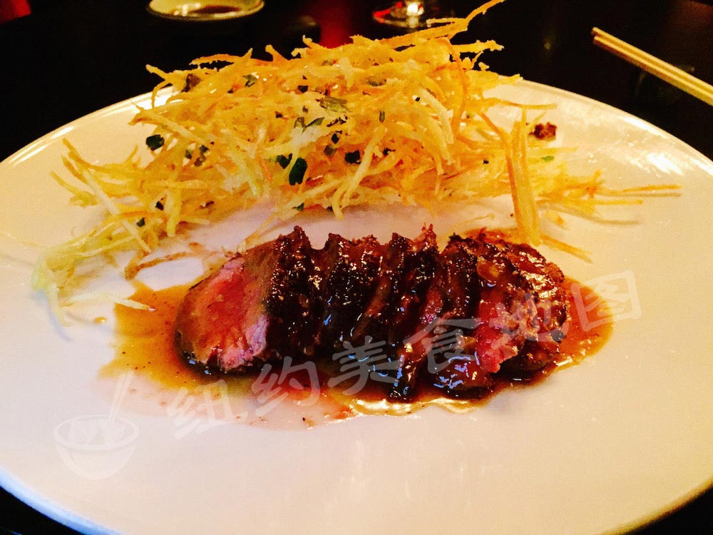 这道菜后来被M评为今晚最好吃的东西。可惜不是牛肉,是薯条。。。其实小蓝觉得这道牛排相当不错,和牛肉质本就软嫩鲜美,五分熟的熟度也把握的非常好,黑胡椒的调味虽然浓了点,但配上和牛的咸香相得益彰。口感很好,真的可以说是入口即化而且很JUICY。红薯条是处理成极细的丝儿然后入锅炸的酥脆,搭配起来很不错。除了量小点,其他还是很不错的。