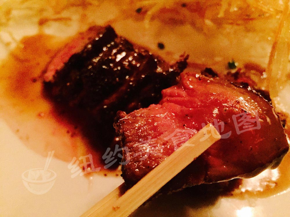 终于吃到了传说中的鹅肝饺子,名不虚传!有点像锅贴的形式,饺子皮薄儿馅儿大,用油煎的脆脆的,一口咬开,鹅肝特有的腥香包裹了整个口腔,shortrib的肉质很嫩滑,蔬菜只吃得出口感,牛肉和鹅肝混合的特殊香气十分强烈,伴着肉汁儿一口一口吃下,吃罢一只再来一颗点缀的招牌樱桃干,微酸清甜顿时解腻,好让你准备好再来一只。这道前菜非常不简单,小巧精致并且非常完整,推荐!