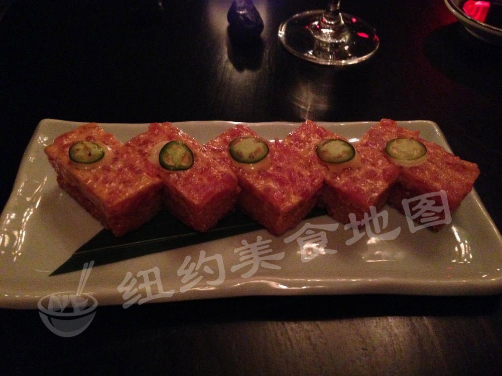 这道也是他家必点的特色之一。Fatty Tuna剁成鱼末与特制烘培过的米饭组合有些像寿司,酥脆的米饭与柔软的鲔鱼大腹融合在一起,还不赖!