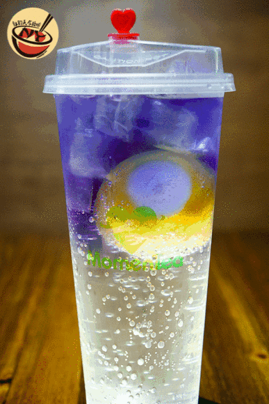 一整个柠檬在雪碧汽水中载沉载浮。蝶豆花的本色是蓝色的,而遇上柠檬则会迅速的变成紫色。看着杯内层层梦幻般的颜色递进,“透心凉”的气泡不断冒着,一股不言而喻的清凉扑面而来。