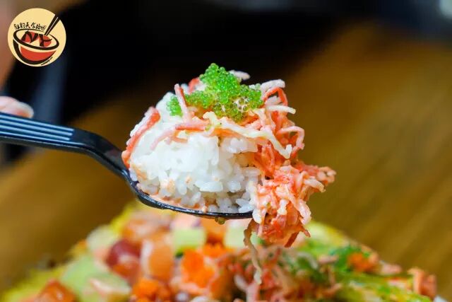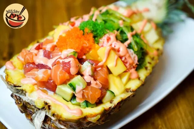 新鲜的tuna、salmon刺身和黄瓜、芒果、菠萝、蟹肉 、海藻等原料被分区码在菠萝碗里,顶部撒上酥脆的炸洋葱和鱼籽。