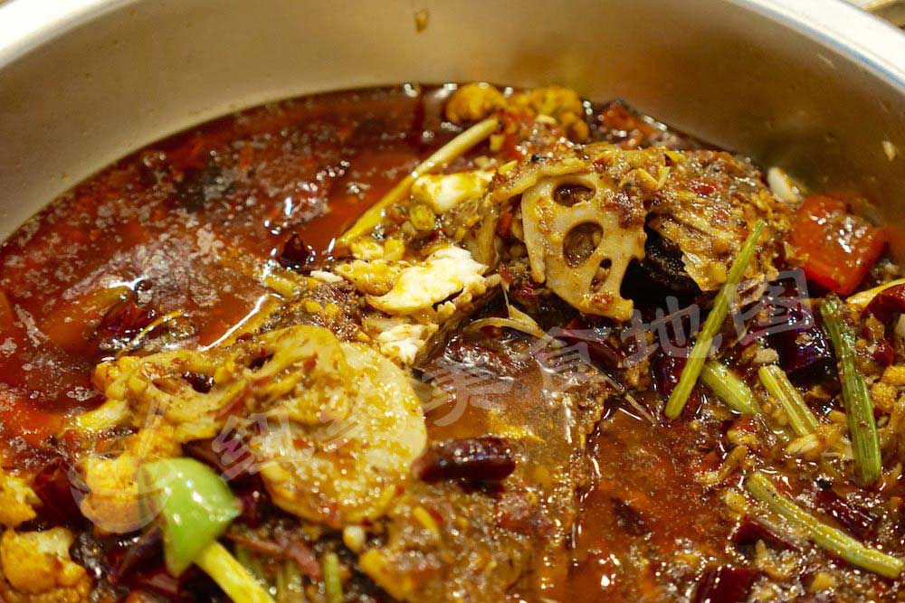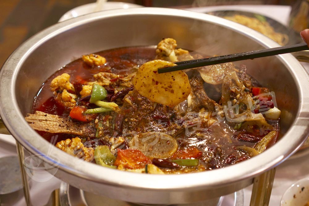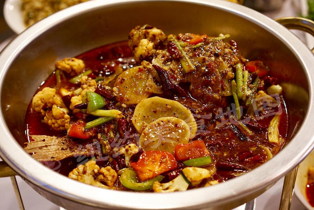 配菜有土豆,藕片,花菜,芹菜等,也都非常好吃。整道菜散发着浓浓的孜然味和辣椒香,一下把小编拉回了在老家重庆的夏天,吃万州烤鱼喝夜啤酒的火辣旧时光。不过同行的一个小伙伴感觉偏咸,所以建议口味清淡的朋友可以要求大厨少盐。