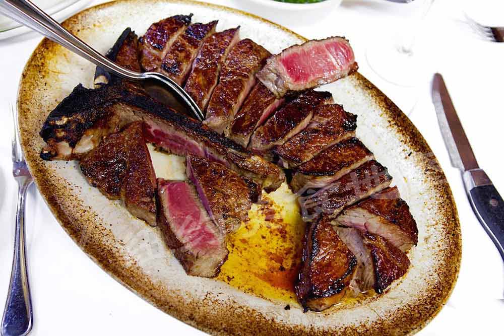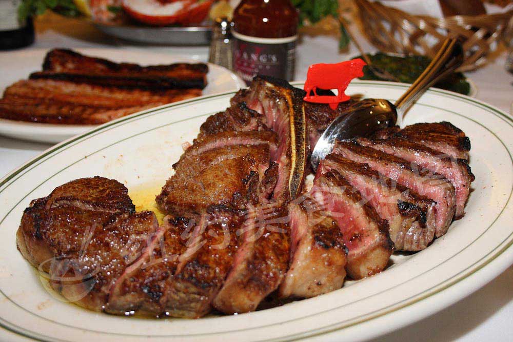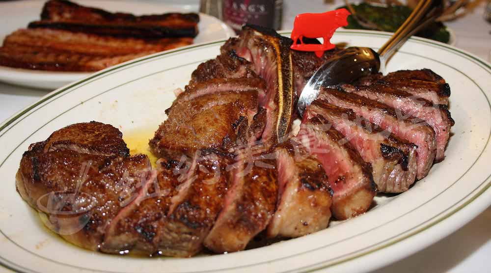 Porterhouse 算是更大版本的T骨牛排,牛排本身以T型牛骨分开,骨头两边都有大量丰富的牛肉,由T骨一分为二,一边为Fillet (菲力牛排) 一边为New York Strip(纽约客牛排),一份Porterhouse, 享受两种不同部位的的牛肉口感: 菲力牛排属于牛排中最嫩的一种,肉质软嫩多汁,脂肪含量较少;而纽约客的肉质相对紧实,很有嚼感,脂肪含量丰富。