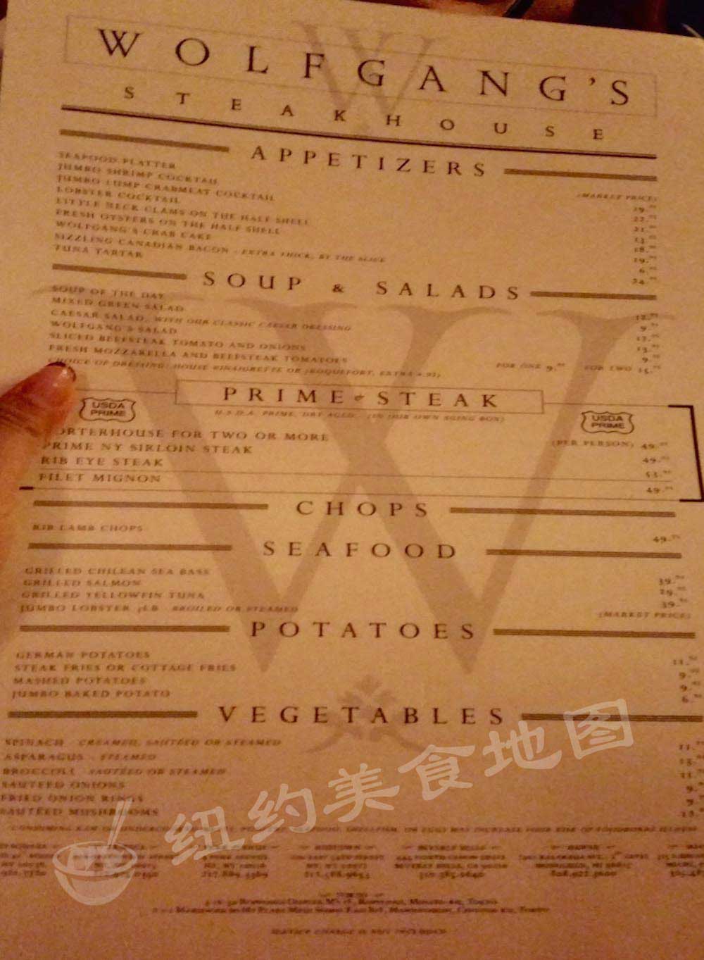 Wolfgang-19小蚊有个爱吃肉的朋友,生日时候点名要吃顿上好的dry aged 牛排,本来小蚊开始想的是Peter Lugers, 可是提前一星期也没有订到合适时间的位置,灵机一动,就想到这家同样也是获奖无数,并且与之有深刻历史渊源的Wolfgang Steakhouse。