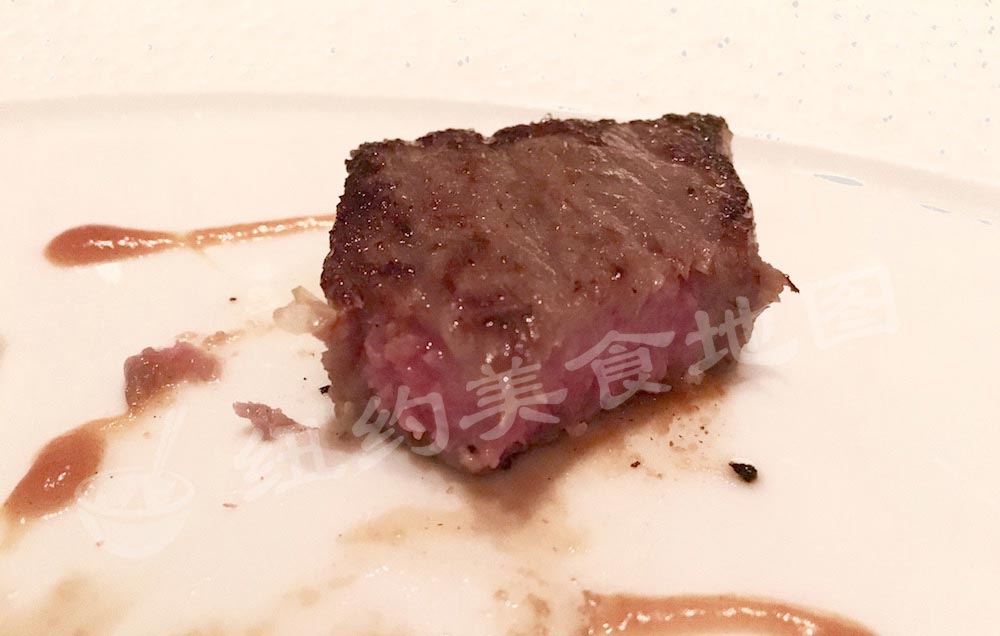 le-bernardin-07King fish 是 SASHIMI 的形式,泡在热汤里,顶部加了一坨鱼子酱。其实这道菜给人的感觉怪怪的,King fish 被热汤浸的温温的,口感较为软绵;鱼子酱略腥咸,抹在酥脆的面包片上,蘸上热汤浓郁的奶香还不错,但是整道菜没有太讨喜。