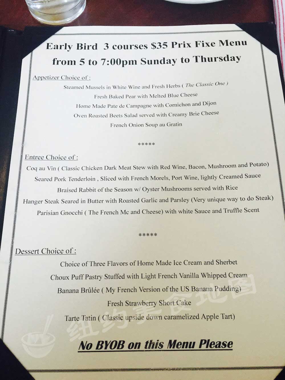 每周日到周四,5PM-7PM的PRIX FIX MENU,三道菜的选择丰富多样,还可以自带红酒,只需要$10每两人的开瓶费。