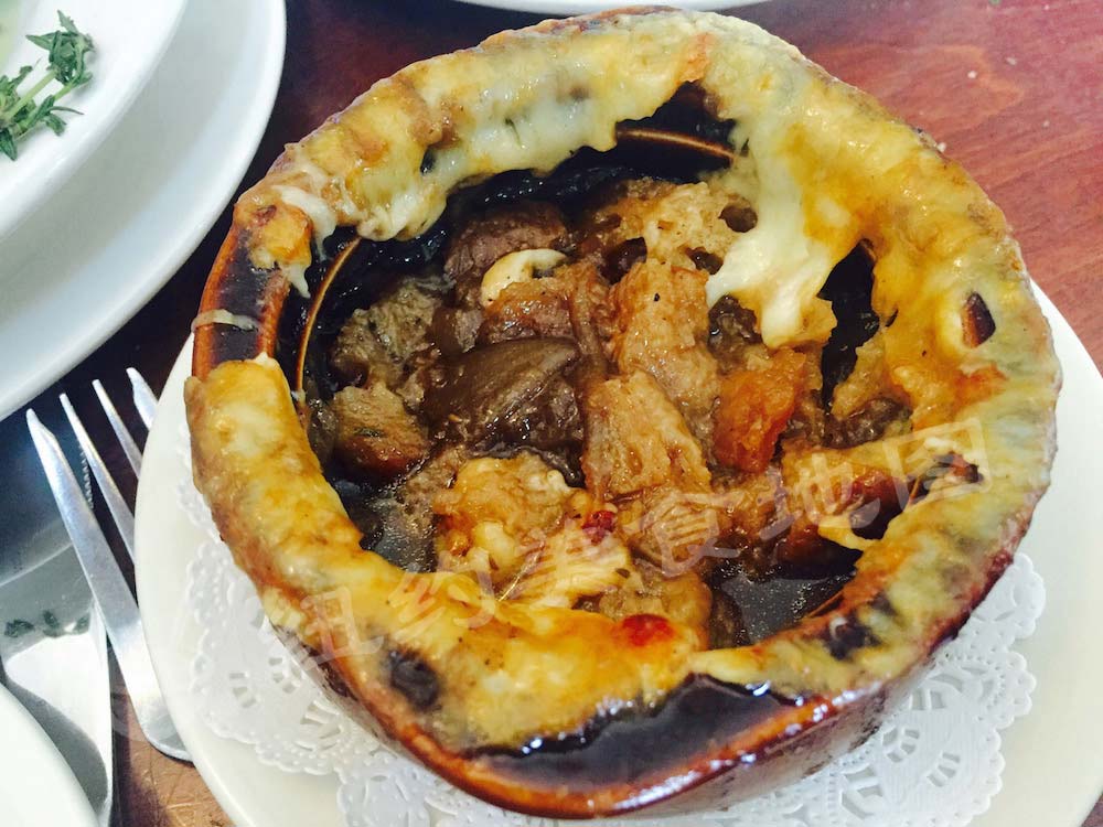 小编一直认为,一道好喝的洋葱汤,往往是可遇而不可求的。看似简单家常的法式洋葱汤并不需要太多秘诀来烹制,只需要两个字“用心”。光光是把洋葱用慢火炒成焦糖色这一道步骤,不仅是成就这碗汤的关键,更是考验厨师技术与耐心的融合。好的洋葱汤,颜色会呈自然的焦糖色,入口那淡淡洋葱的焦甜味儿,更是让人对洋葱汤欲罢不能的理由。如果一家餐厅决定将法式洋葱汤写进餐牌,那必须得是经得住考验,有信心给每一位客人招待的货真价实的洋葱汤才行!这家店的洋葱汤做到了!