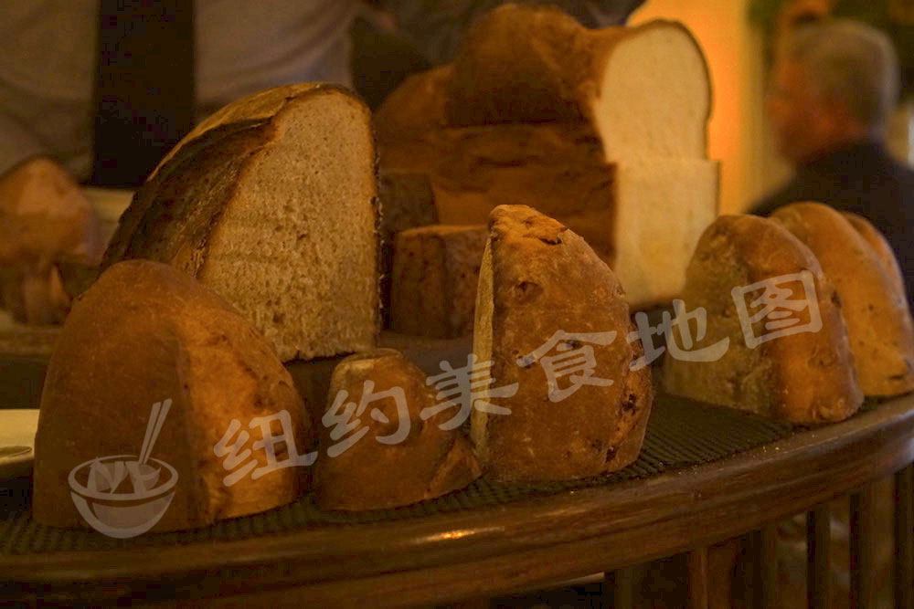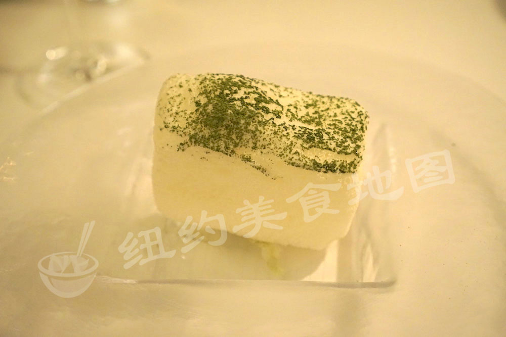 差不多这个时候,他家引以为傲的流动面包车过来了。非常Nice的大叔带着骄傲的神情给我们介绍每一种面包,包括口感,松软度,RICH程度等。Bouley有自己的Bakery,烘烤出的各式面包款款惊艳。推荐Fig、Saffron Walnut、Pistachio Hazelnut和Kuzu,新鲜烘焙出的面包细腻度和湿度都非常赞,每次选一两种,吃完大叔还会体贴的过来问你还需要什么,因此光是面包已经足够撑。话说地图君吃完招待和前两道菜(不算面包)就已经9分饱,接下去的各种基本靠撑。足见他家的分量。