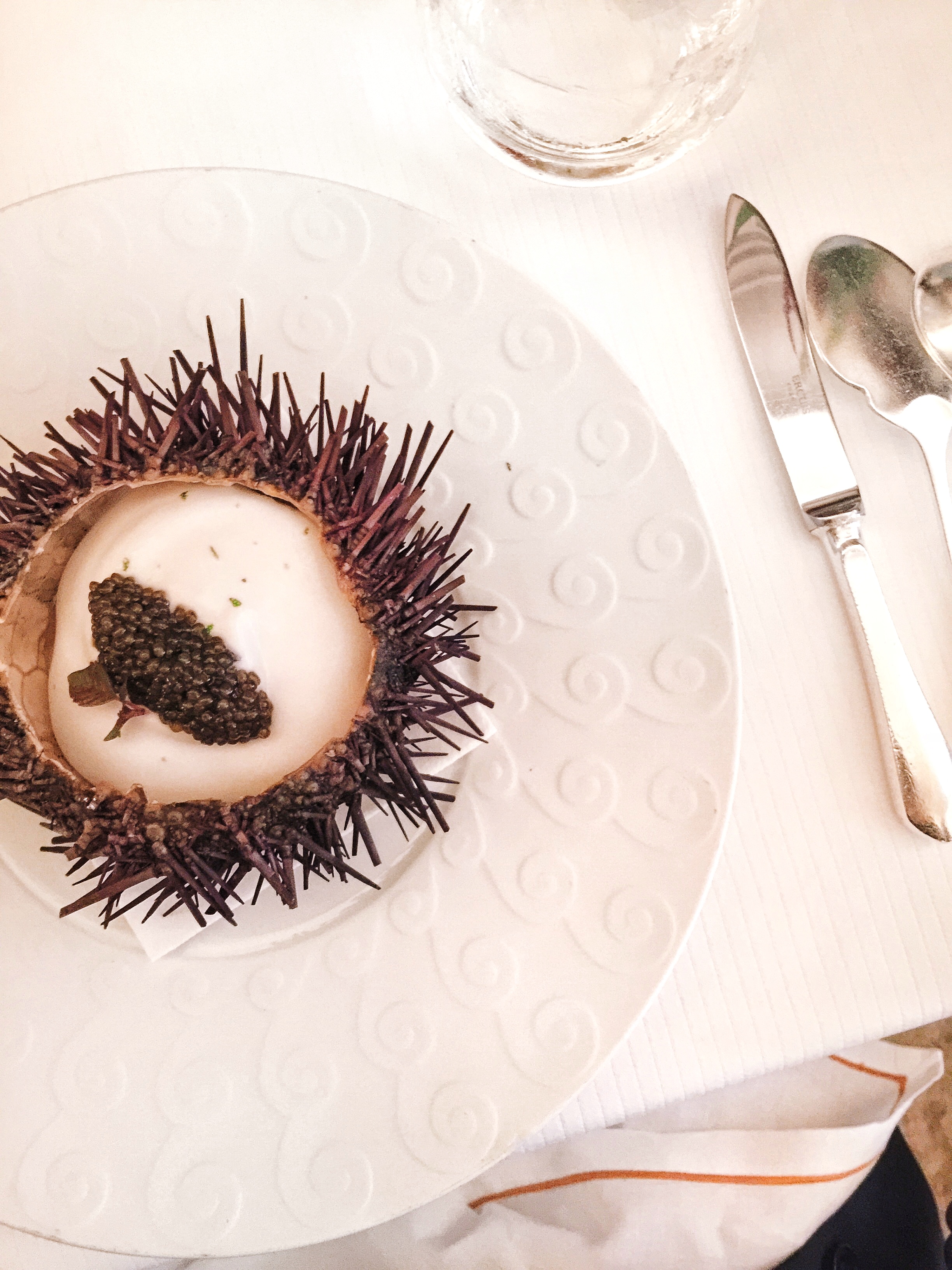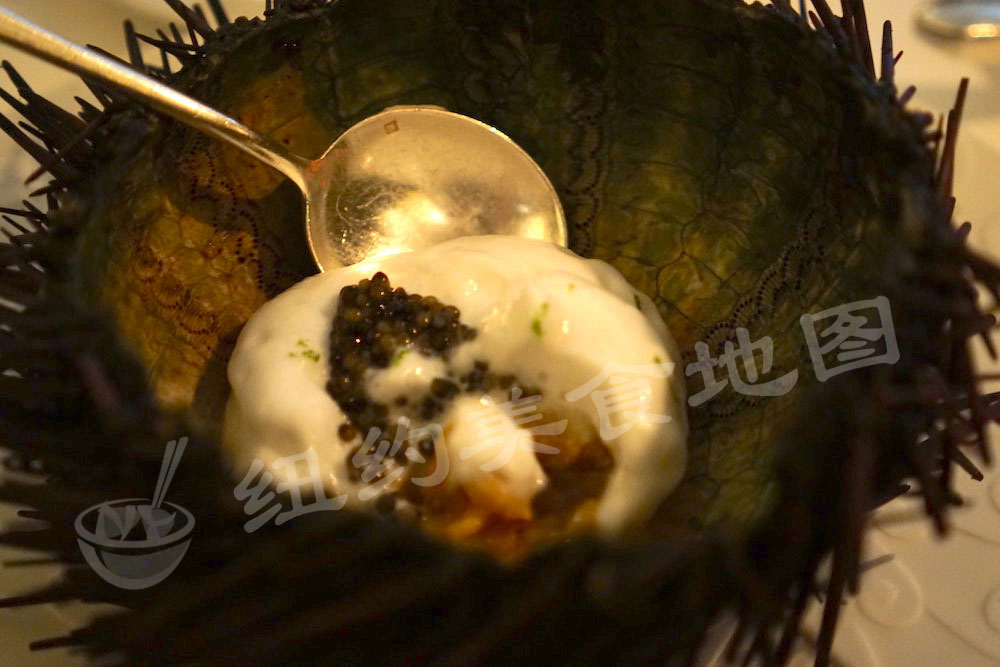 这道菜要说吃一口,眼泪掉下来真的不足为过。新鲜的 malibu 海胆做容器。柚子皮做的JELLY切成小方丁,与新鲜的海胆拌在一起,打上青苹果做的FOAM,再加上一勺上好的鱼子酱。从上至下,先挖一勺鱼籽和FOAM入口,清甜的海洋气息,咸鲜适口的恰到好处,后味儿LIME的清香慢慢融化至口腔,和鱼籽爆开在口中形成强烈的互补;再深挖,清甜的海胆出场,甜度裹着foam的酸鲜再加上柚子皮的JELLY沁凉和化开的微苦,在口腔中上演一出壮丽的海洋交响乐。实在是语言的贫瘠。但将每样食材尊重原味又搭配的如此淋漓尽致,如此的创造,真的是让人惊喜经验惊叹!