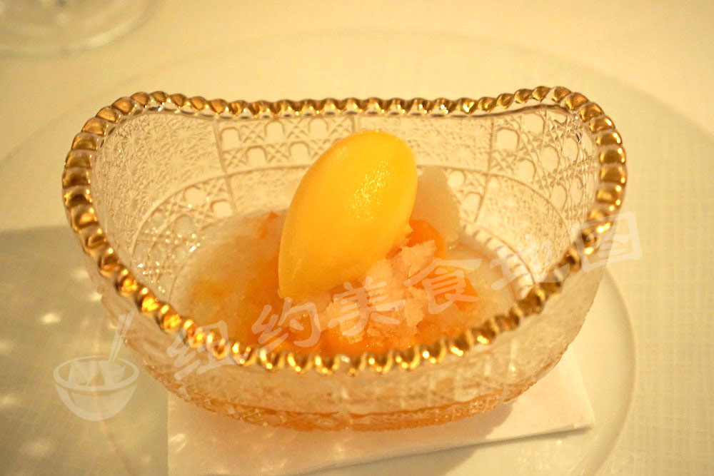 第五道就是SORBET的选择,Cranberry和Apricot,搭配果粒,十分的清口和酸。两种水果本就比较酸。不过在吃完浓重的一餐后来一份这样的清新Sorbet润润口,其实很好
