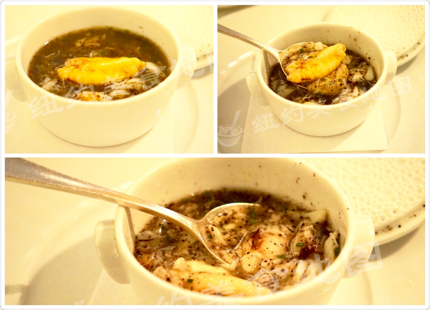 掀开碗盖的一瞬间,黑松露的那种独有的勾魂的醉人的油香气儿就迫不及待的钻入鼻腔,深深的猛吸一口带着温度的混合松露和蟹肉的香气,就已经有了深深的幸福感。整碗都是纯蟹肉,dougeness crab整条的蟹腿肉和细碎的蟹肉充斥着口腔,细腻、饱满、十足的鲜,都被浓郁的黑松露挑逗起来,温热的汤体则是微微的浓咸滋味儿,浓而刚好,底部水滑肉嫩的蒸蛋更是润滑了口感。为了这道菜,再回来N次也愿意。