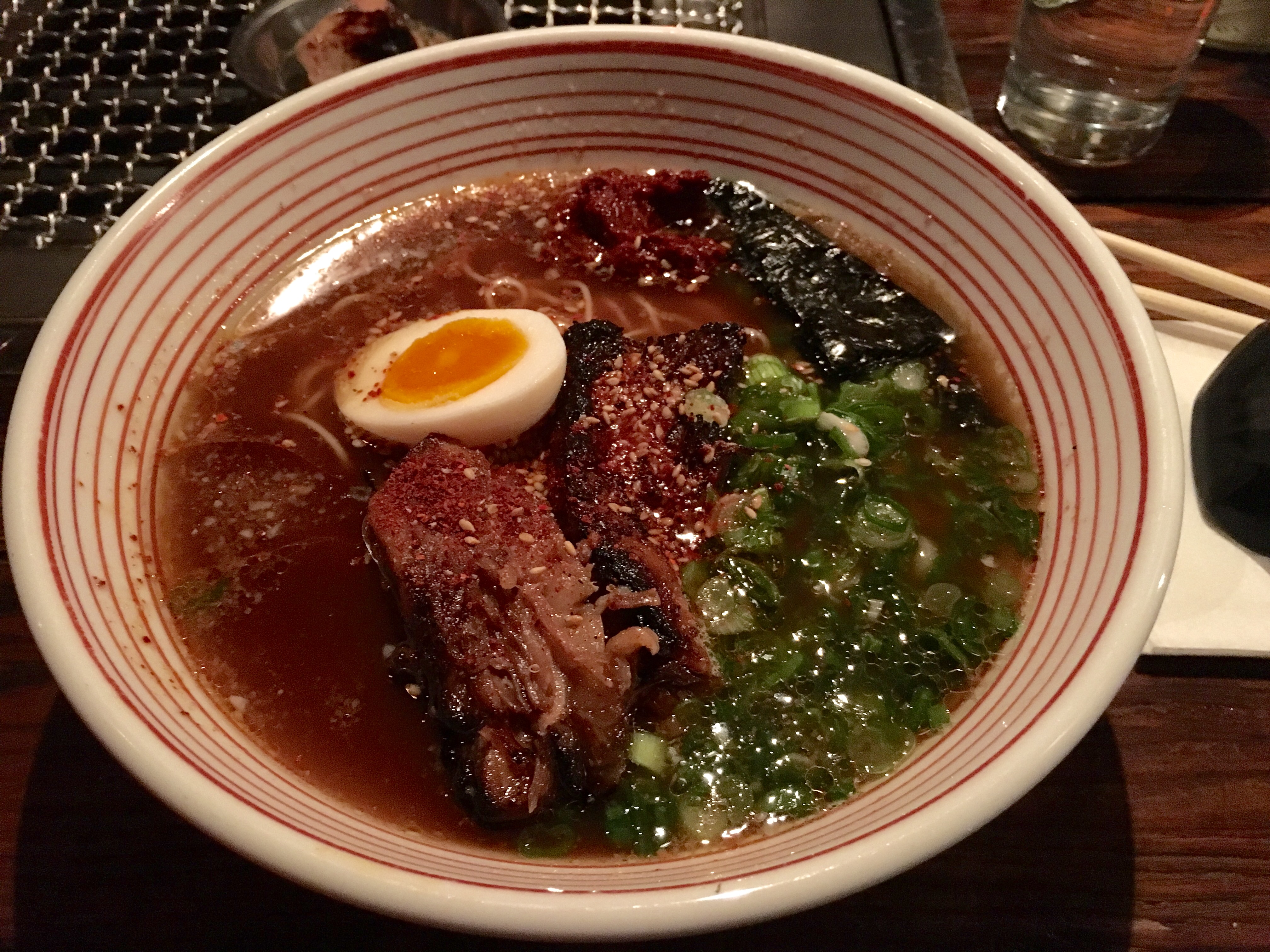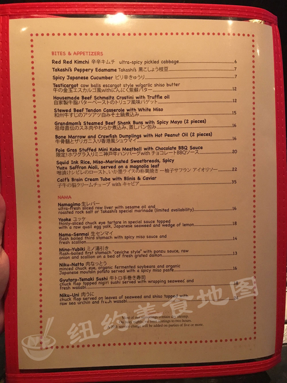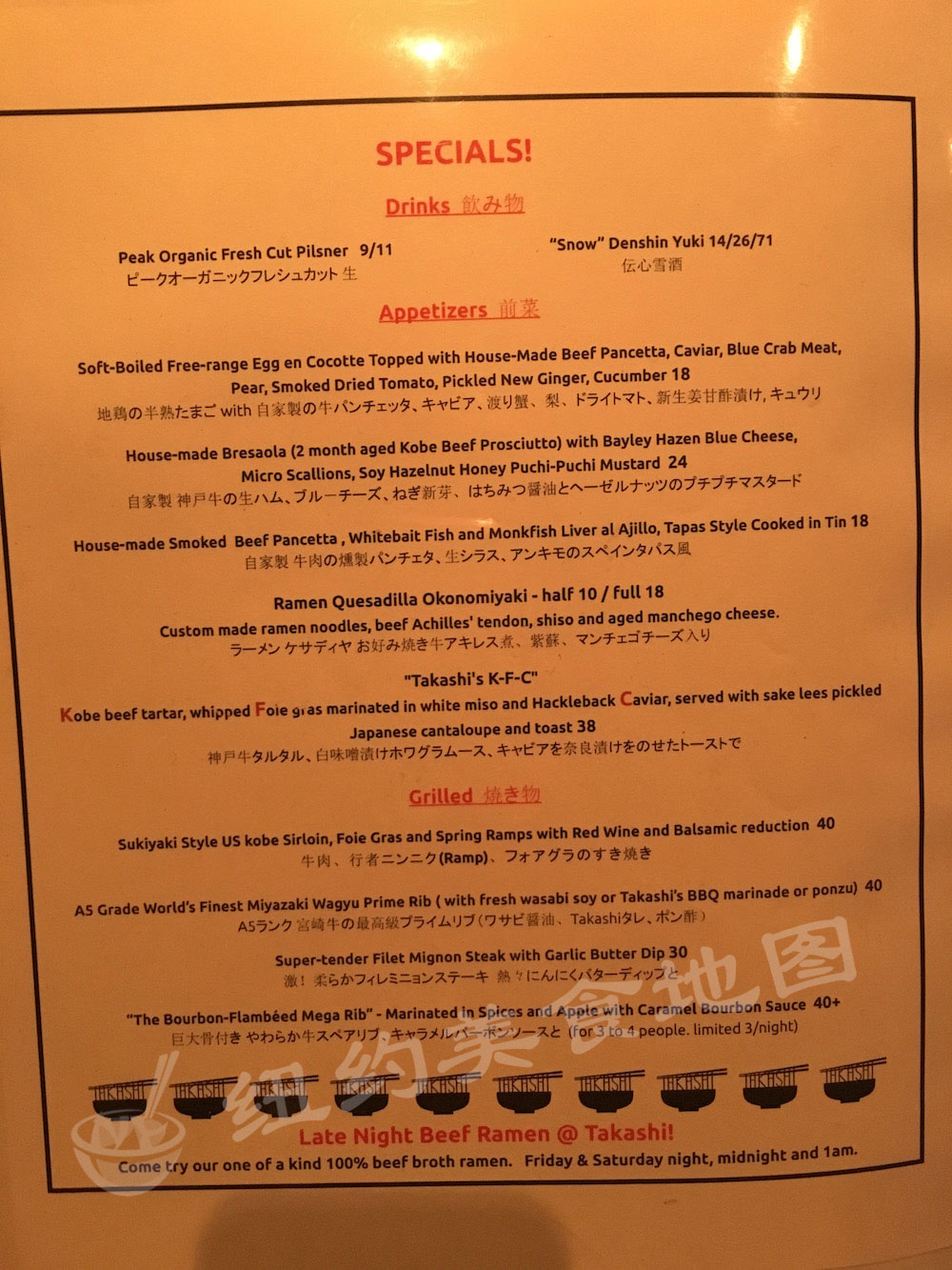 TAKASHI位于西村,由出生长大在日本的韩裔帅哥创建于2010年。TAKASHI致力于将传统日式烧肉结合自家味儿带来纽约,因此他家的烤肉有些日韩风,在开餐前赠送的小菜会有KIMICHI,SAUCE也有辣味噌加秘制调味汁儿,最有噱头的午夜拉面传说来自TAKASHI的祖母秘制配方,汤底就是加了韩式辣味噌的牛骨汤,标准日韩混血的烤肉店。