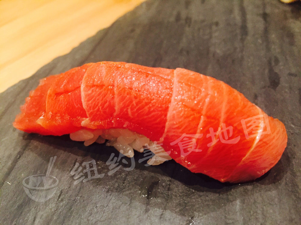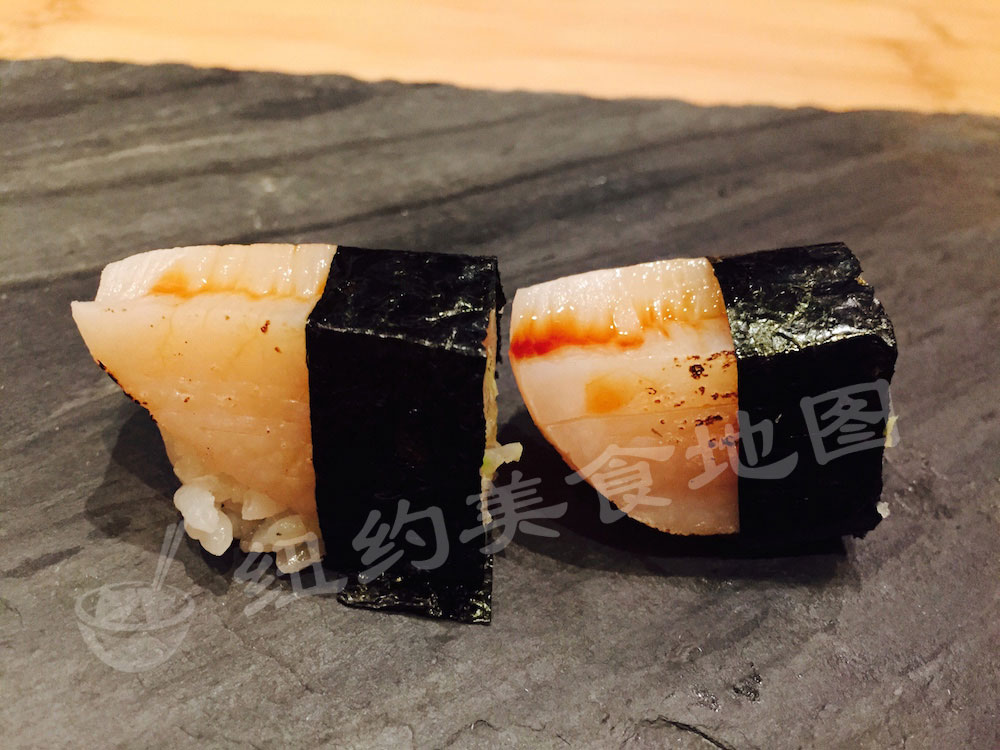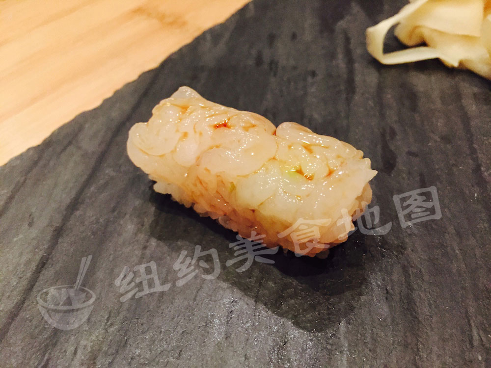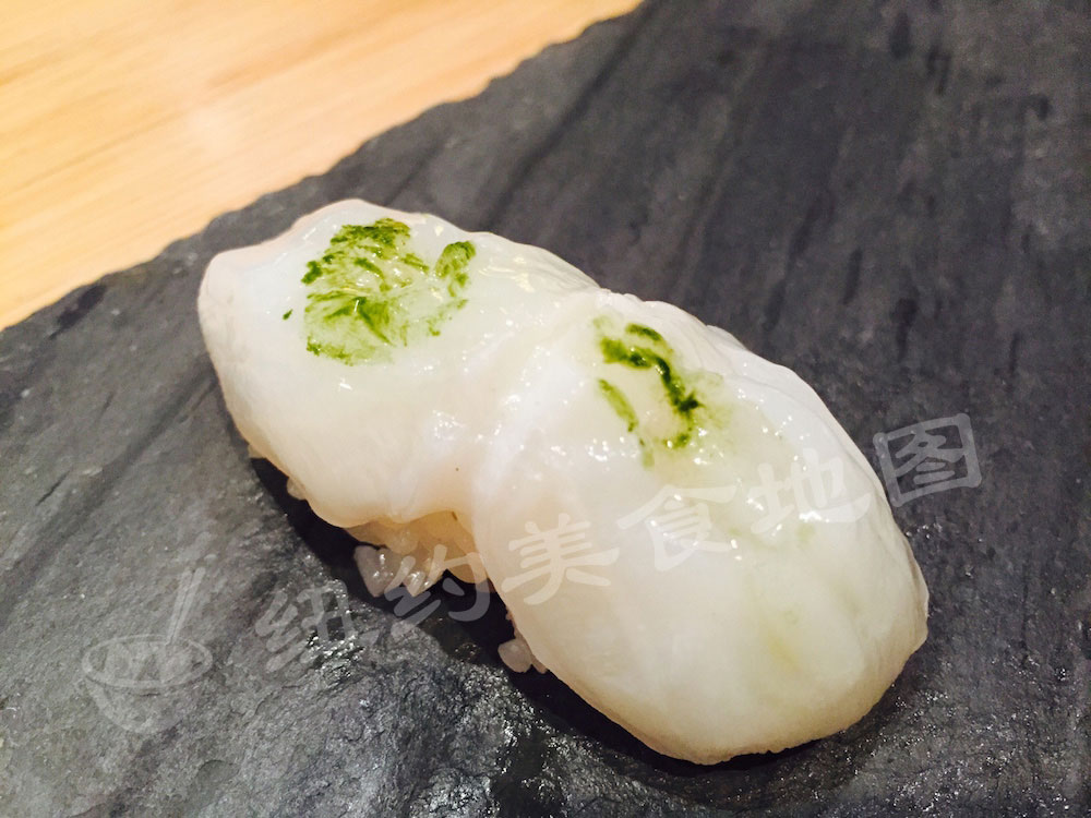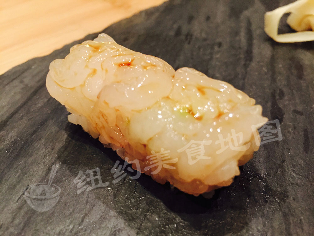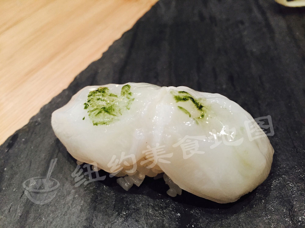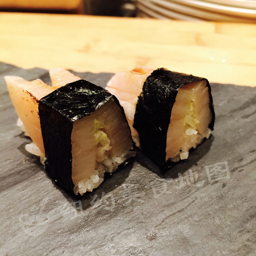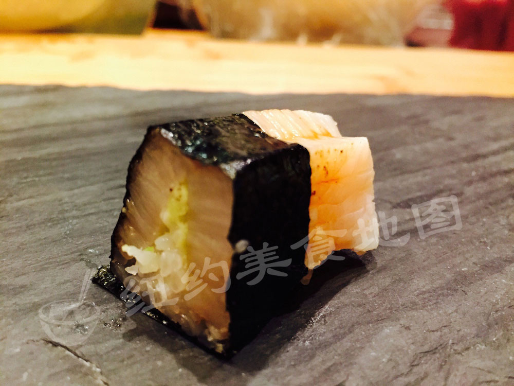 很新颖用心的一贯!第一次吃到生章鱼脚做的寿司,完整一根章鱼脚,切下来一小片,然后中间切开,拍打成型。调味是柚子胡椒和绿茶盐。超级好吃!入口先是柚子胡椒的浓烈咸香,伴着咀嚼,感受到章鱼特有的脆韧和弹性,很好嚼,师傅有加新鲜柚子汁在鱼生上,后味是抹茶的清苦,很赞很耐回味的一贯!