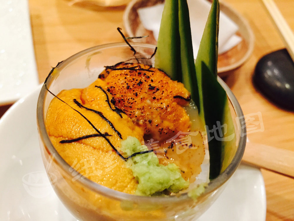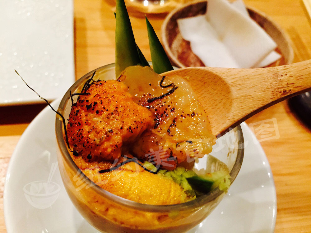 这个也太大方了! 满满一大杯的圣芭芭拉海胆,新鲜的就好像刚刚拨出来一样,色泽金黄,颗粒分明。YOSHI还用了两种料理手法,先铺上两片新鲜的海胆,然后又用喷枪炙烤了一片海胆和扇贝,整个内室弥漫着海胆的焦香。。