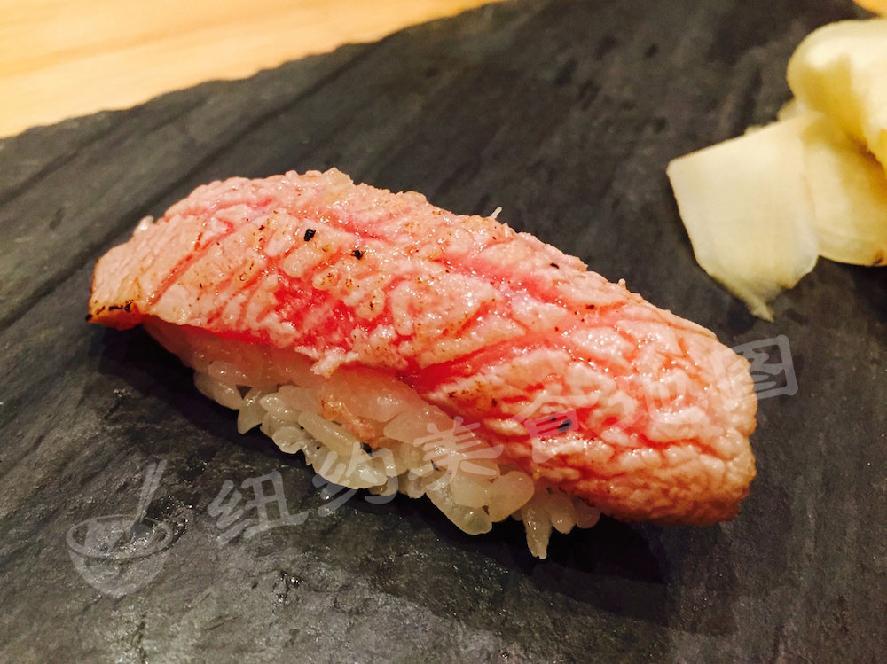 真的以为已经没有了。结果又来这么重量级的一贯,微炙鲔鱼大腹寿司,哎呀这家店真的太大方了!OTORO本来已经油脂丰盈,微炙之后更是满贯油脂饱满的要滴下来了!鱼生薄厚处理的很棒,加上表面细致的刀工处理,位置以后真的恍如吃的是KOBE啊,KOBE or Toro,傻傻分不清楚。滋味很丰盈的一贯,鲔鱼丰厚的油脂在口中满满化开,融合醋饭的温柔,加上海盐调味的提升,满分!