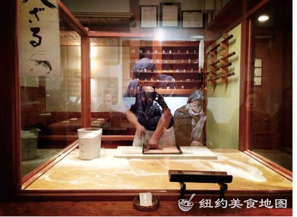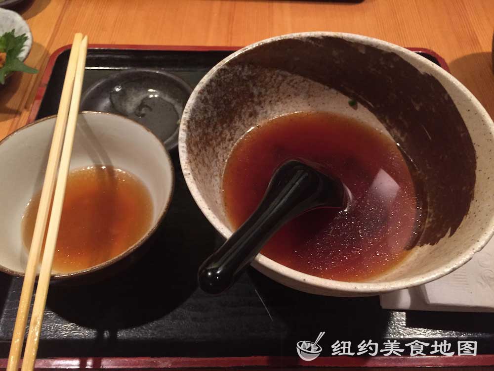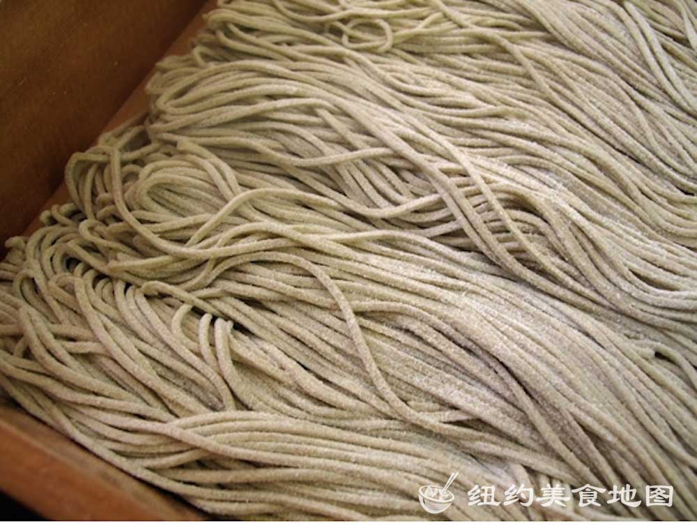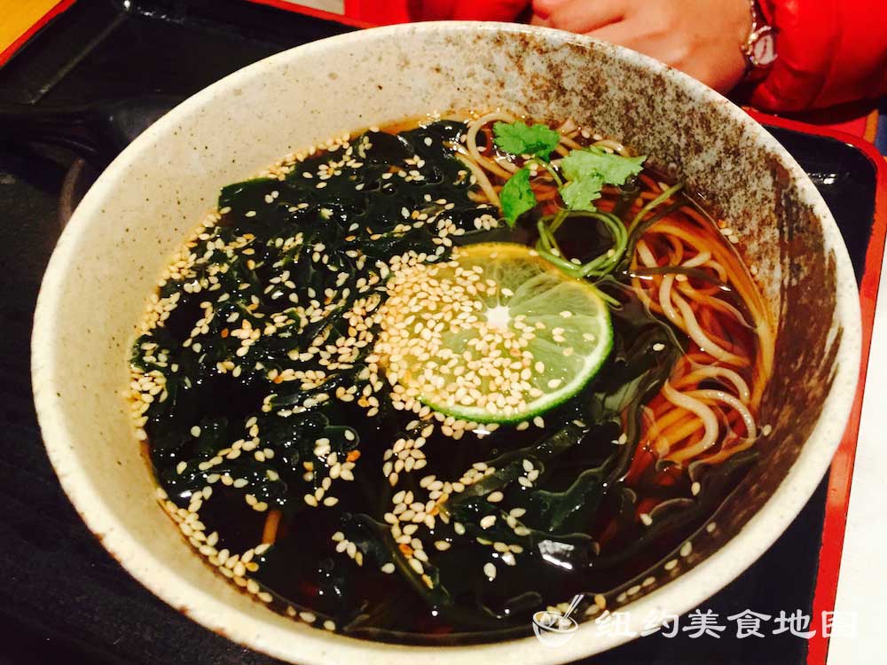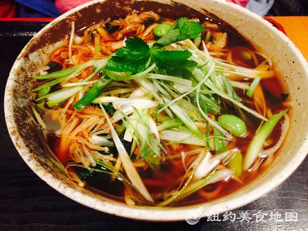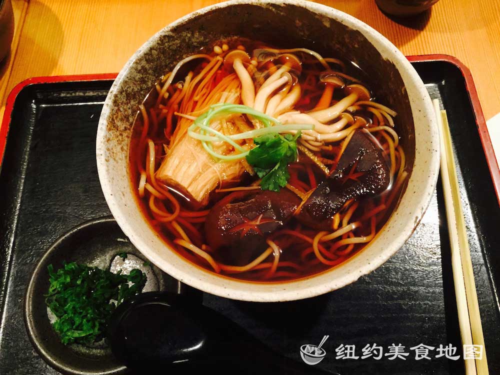 一想到日式荞麦面,小蓝脑子里浮现的就是各大日剧里,男女主角端坐在榻榻米上,面前摆着一小坨煮好的新鲜荞麦面,然后拿起装着酱油的小杯子,边蘸酱油边吃面的情形。拿着杯子吃面的情形实在让人印象深刻,从而对它的滋味也不由心生向往。纽约的荞麦面屋也有几家,这家位于东村的SOBA-YA荞麦面小屋名声已流传已久,所有荞麦面都是新鲜手造,传说还有师傅在展示台里精湛刀工的现切面表演。今天有幸抓了仨吃货好友来此小聚。