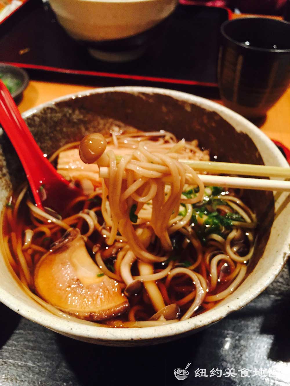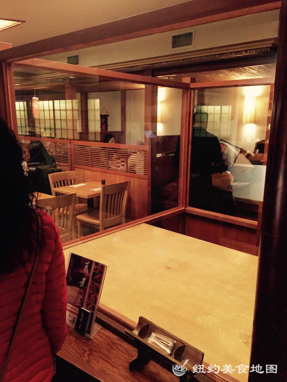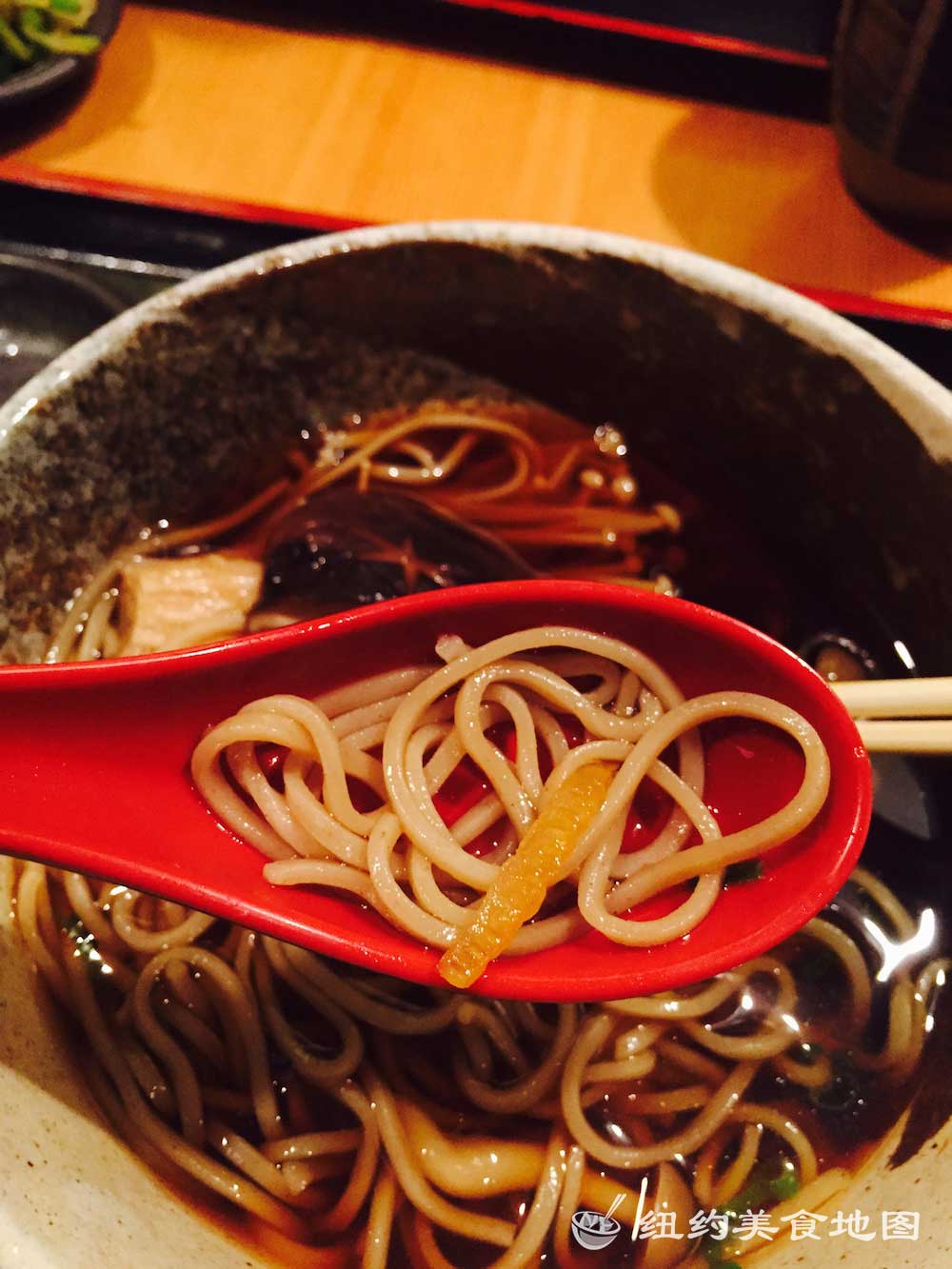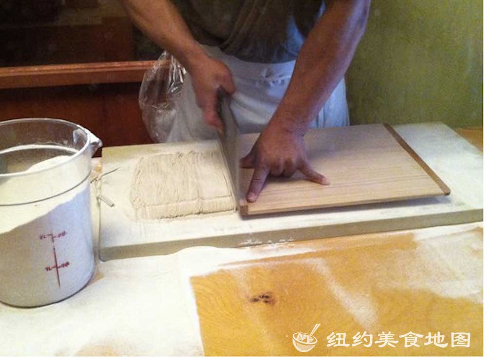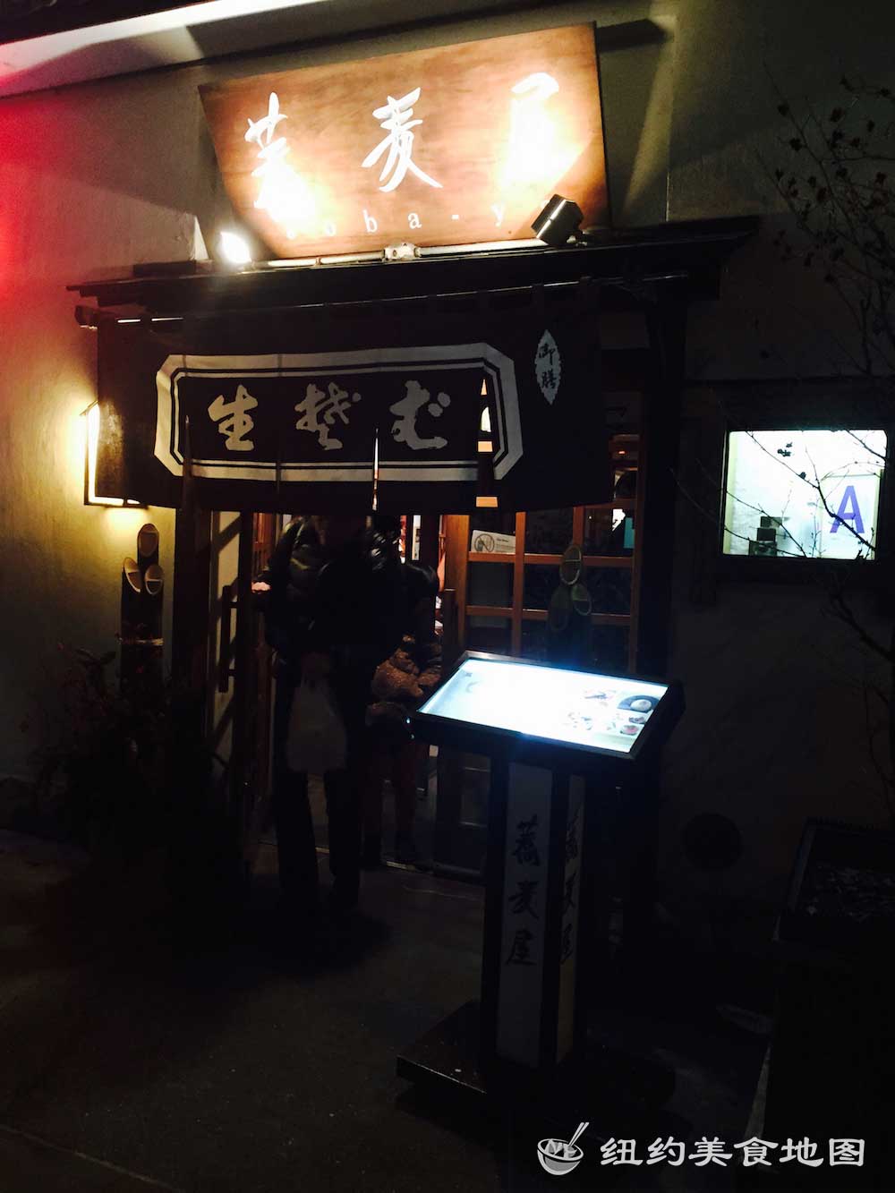 一想到日式荞麦面,小蓝脑子里浮现的就是各大日剧里,男女主角端坐在榻榻米上,面前摆着一小坨煮好的新鲜荞麦面,然后拿起装着酱油的小杯子,边蘸酱油边吃面的情形。拿着杯子吃面的情形实在让人印象深刻,从而对它的滋味也不由心生向往。纽约的荞麦面屋也有几家,这家位于东村的SOBA-YA荞麦面小屋名声已流传已久,所有荞麦面都是新鲜手造,传说还有师傅在展示台里精湛刀工的现切面表演。今天有幸抓了仨吃货好友来此小聚。